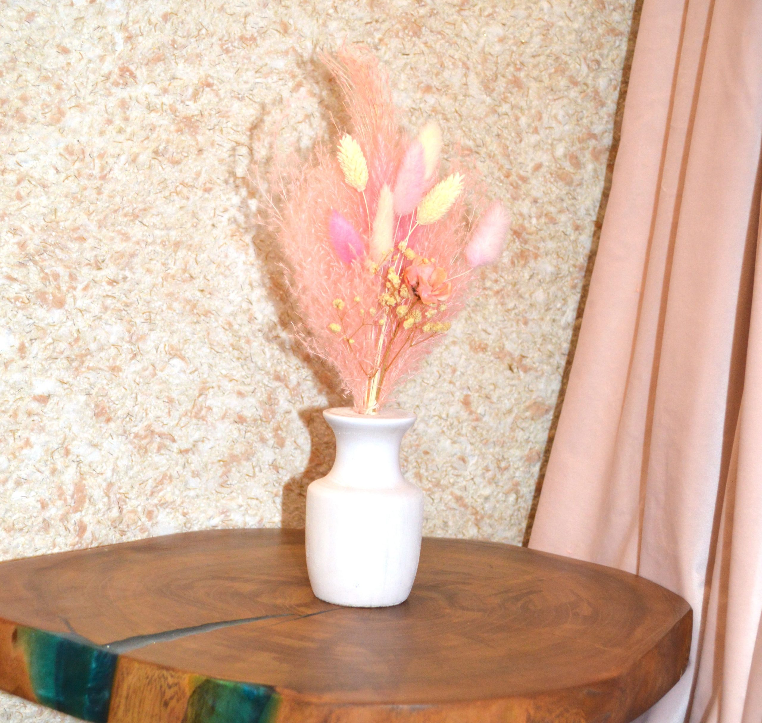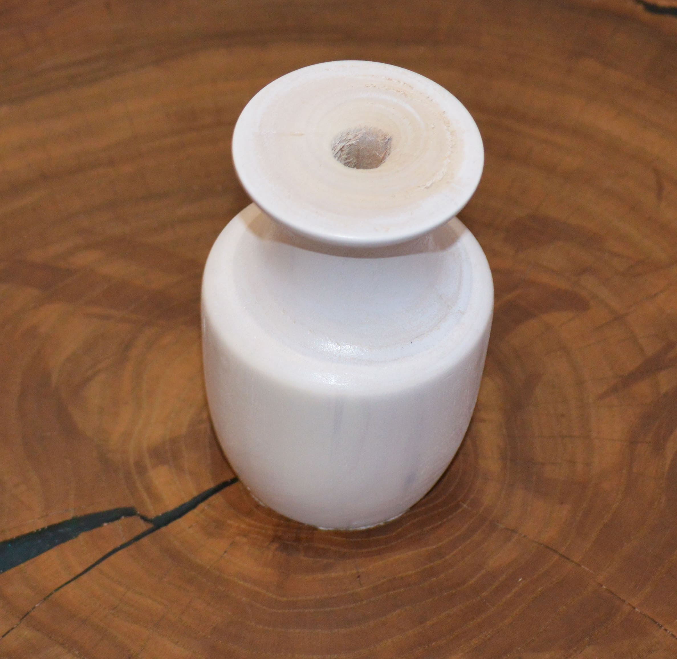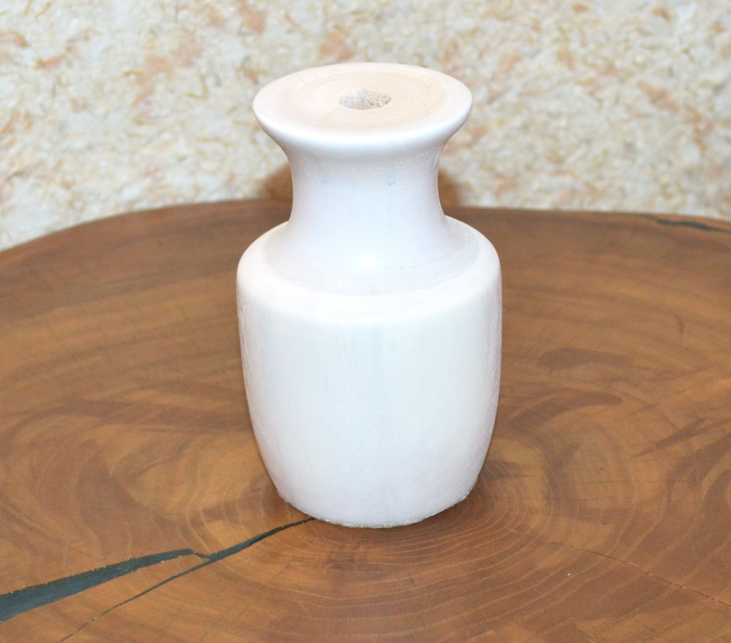 Невысокая, светлая, выполненная из массива клёна ваза под цветы сухоцветы. Размеры: высота — 11 см, диаметр горловины под стебли — 1,2 см, глубина — 7 см. Покрыта: белая, матовая эмаль. Ручная работа в единственном экземпляре.