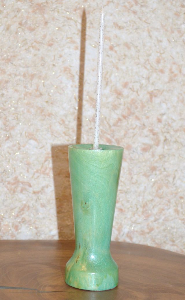 Выполненный из массива клёна, подсвечник под маленькую свечу, станет оригинальным дополнением к определённому виду интерьера. Высота подсвечника — 13,5 см. Посадочный диаметр под свечу — 5 мм (тортовые свечи). Покрыт бирюзовой лазурью. Ручная работа в единственном экземпляре. Одна свеча в комплекте.