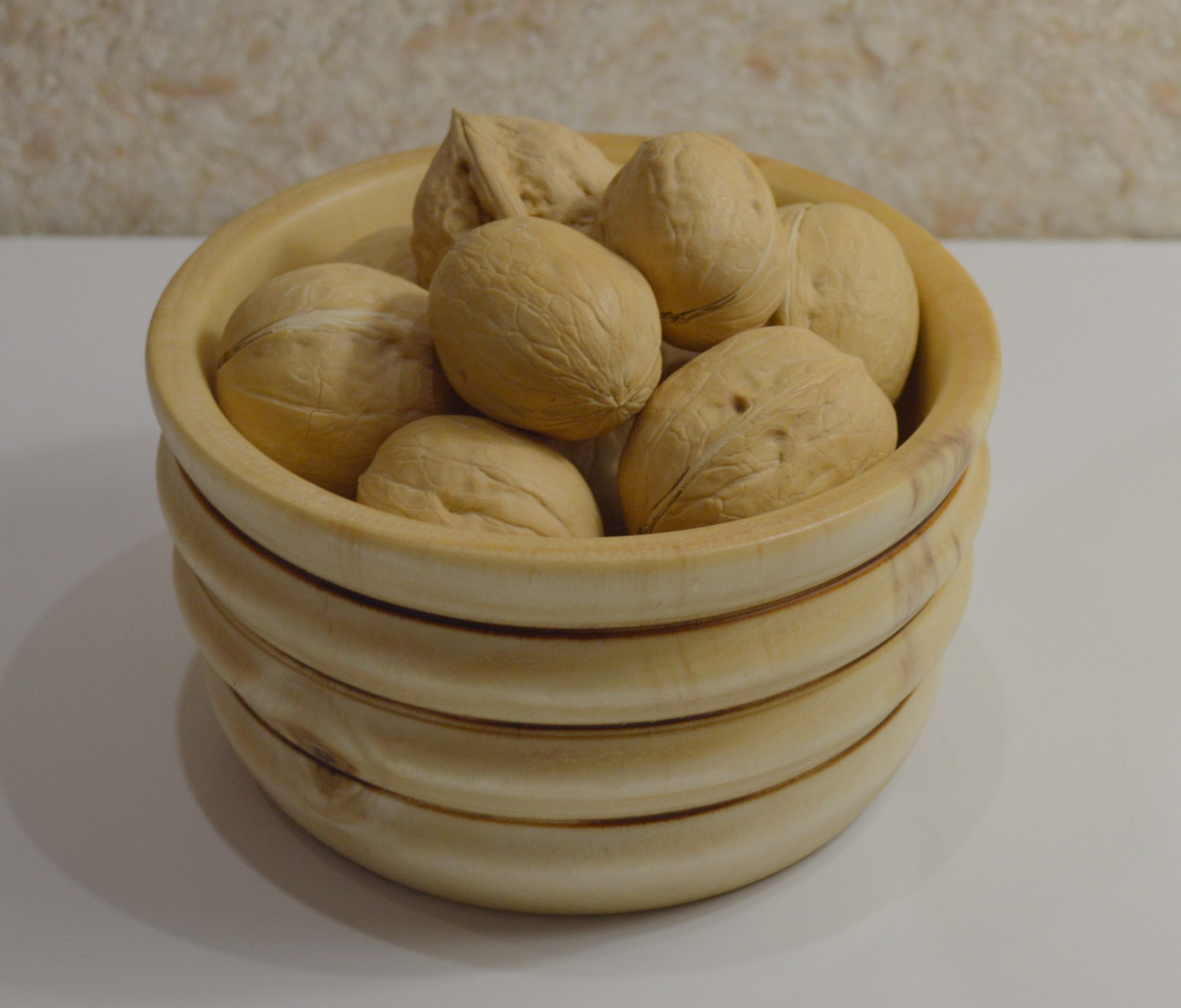Чаша орешница из массива дерева. Размеры: диаметр — 14 см, глубина — 6 см. Естественный рисунок древесины. Покрытие: льняное масло с воском.