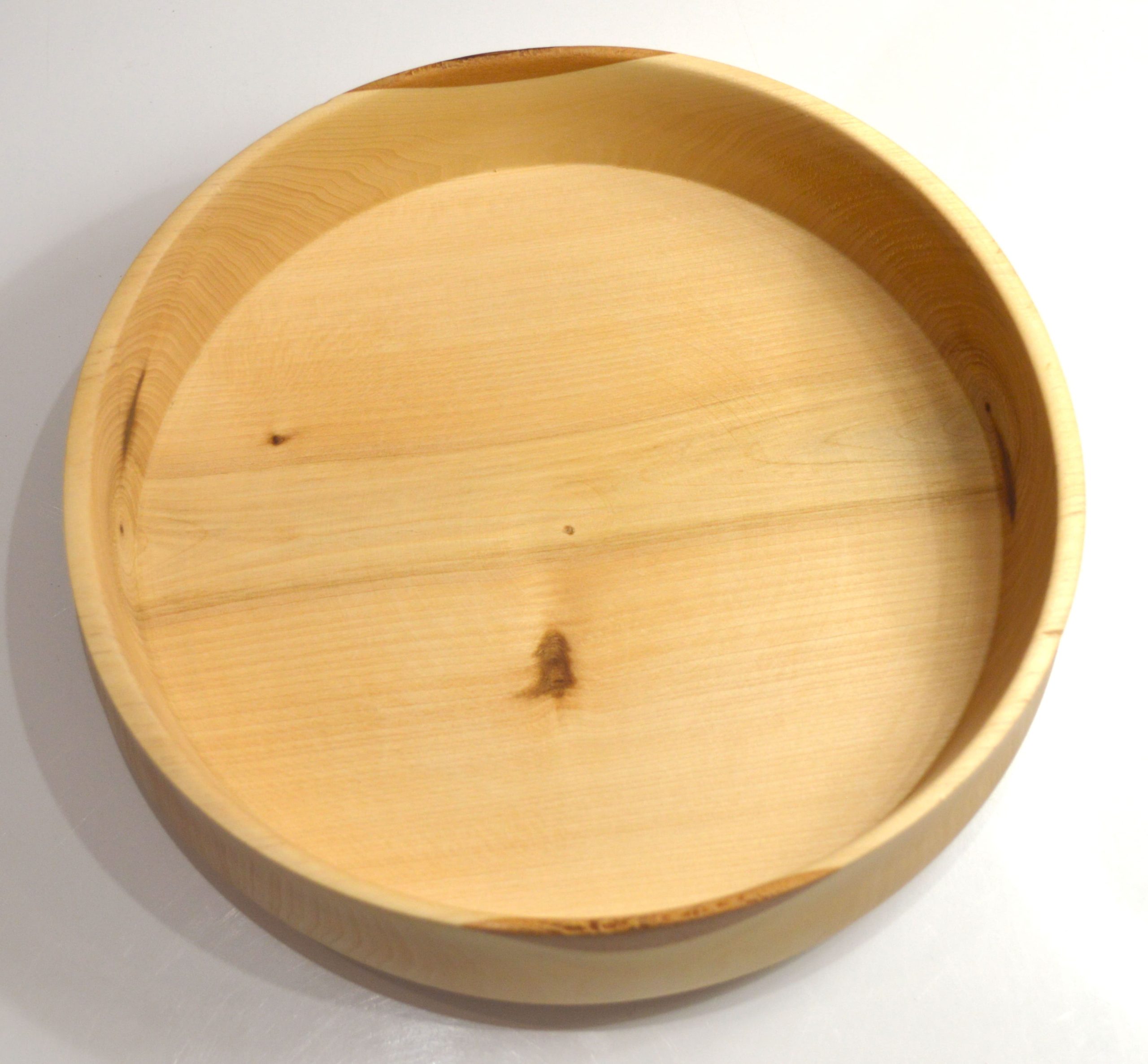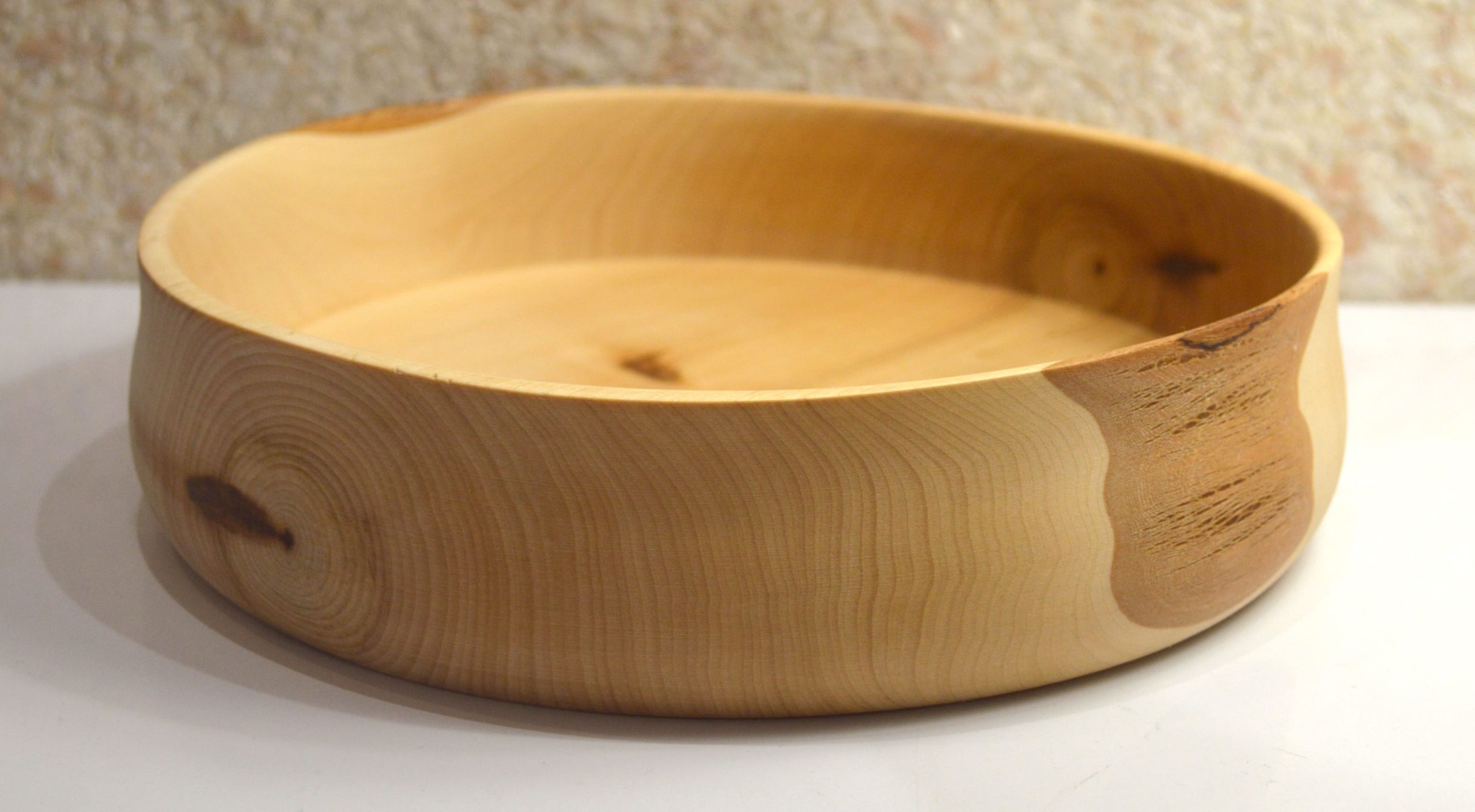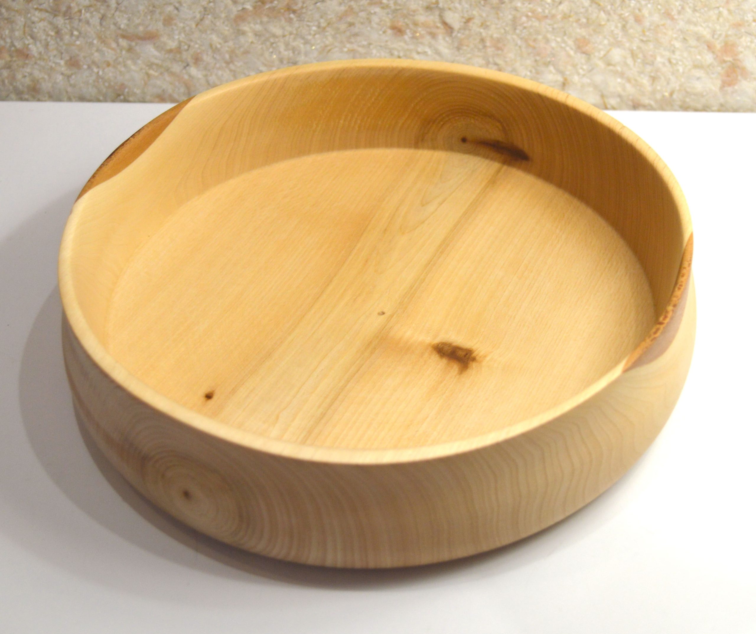 Широкое, выточенное из массива липы блюдо для печенья, конфет, орехов, фруктов и других продуктов. Размеры: высота — 5,5 см, диаметр — 22 см. Естественный рисунок природного материала. Покрыта масло-воском. Ручная работа в единственном экземпляре.