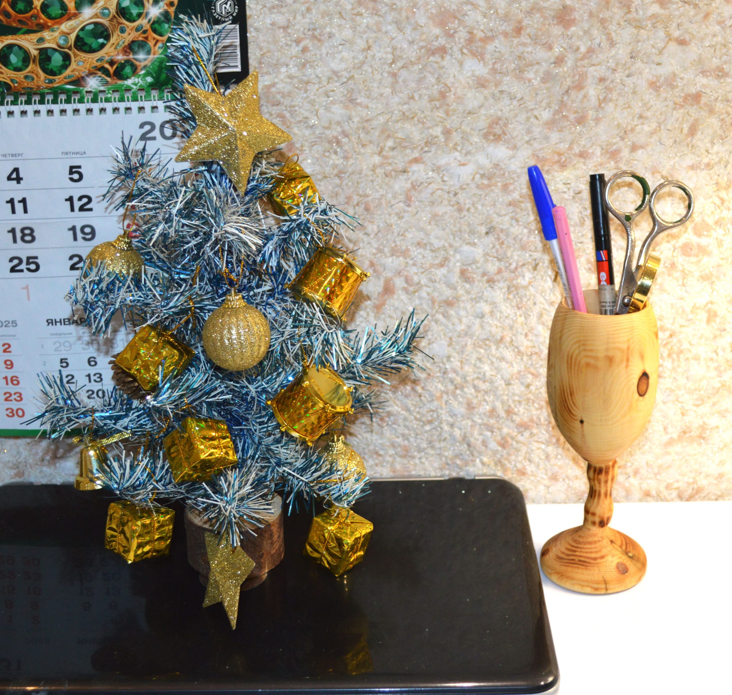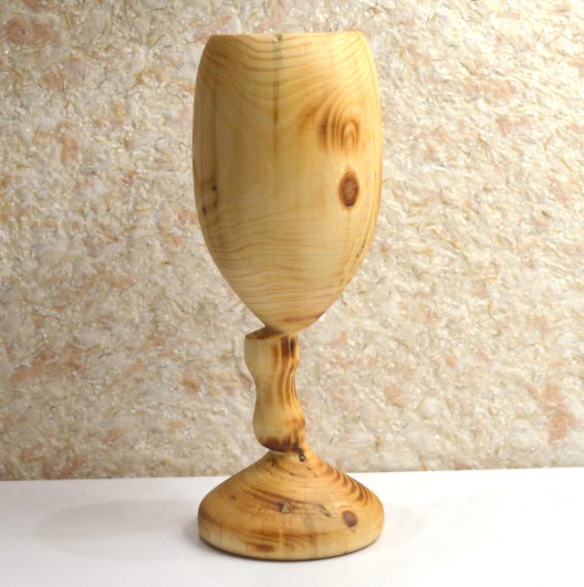 Деревянный, с выточенной экспериментально ножкой со смещением, в форме бокала, органайзер для канцелярских принадлежностей. Массив сосны. Общая высота — 18,5 см, глубина бокала — 6,5 см, диаметр фужера (внутренний) — 5 см.
