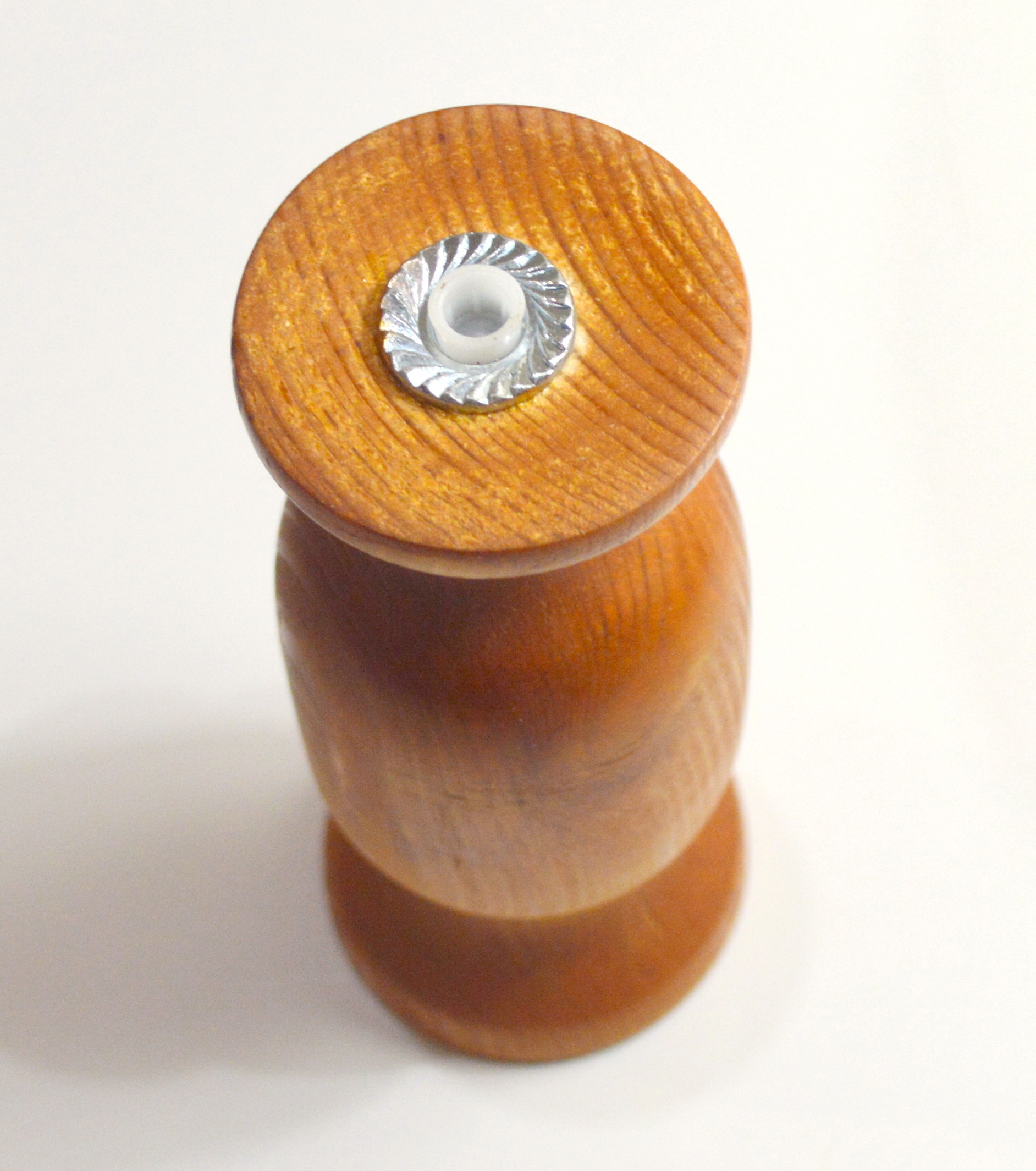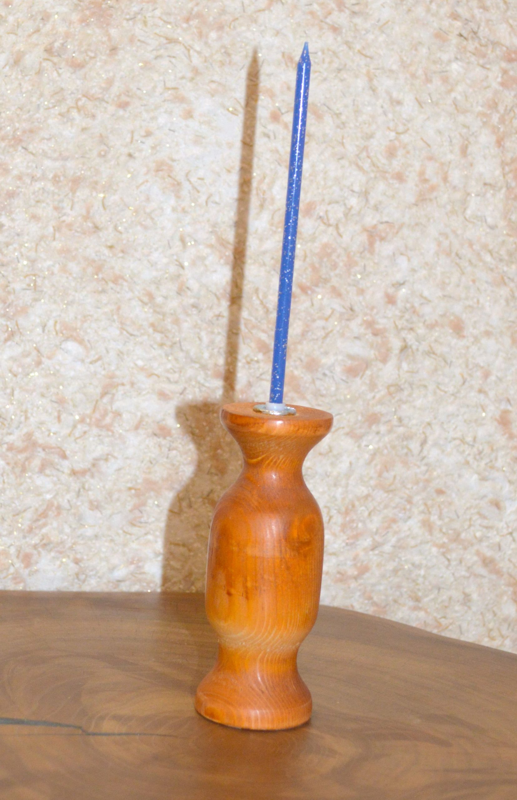 Деревянный подсвечник под маленькую свечу из массива тополя. Высота подсвечника — 12 см. Посадочный диаметр под свечу — 5 мм (тортовые свечи). Для более чёткого выделения структуры дерева, покрыт тонировочной лазурью. Ручная работа в единственном экземпляре. Одна свеча в комплекте.