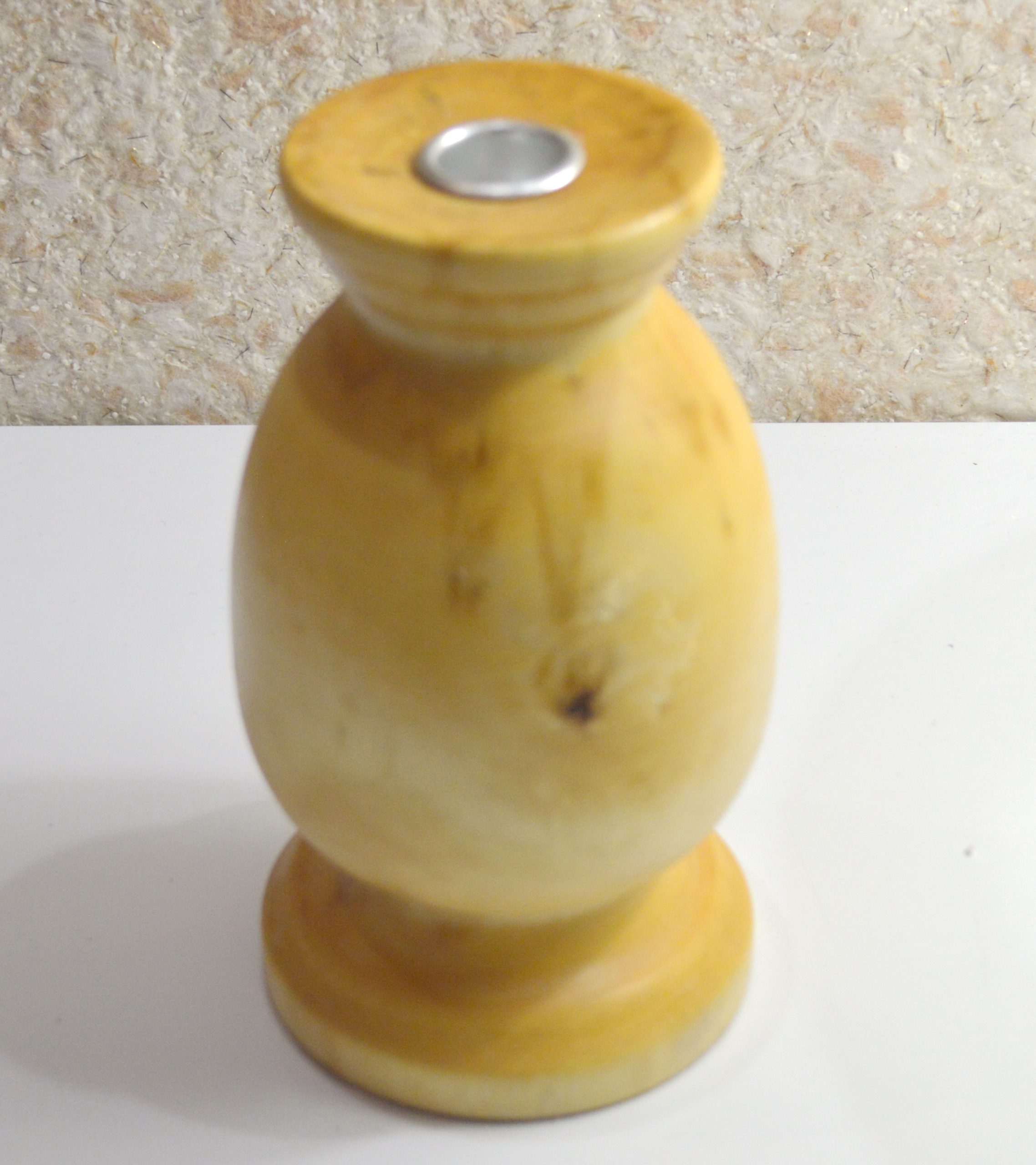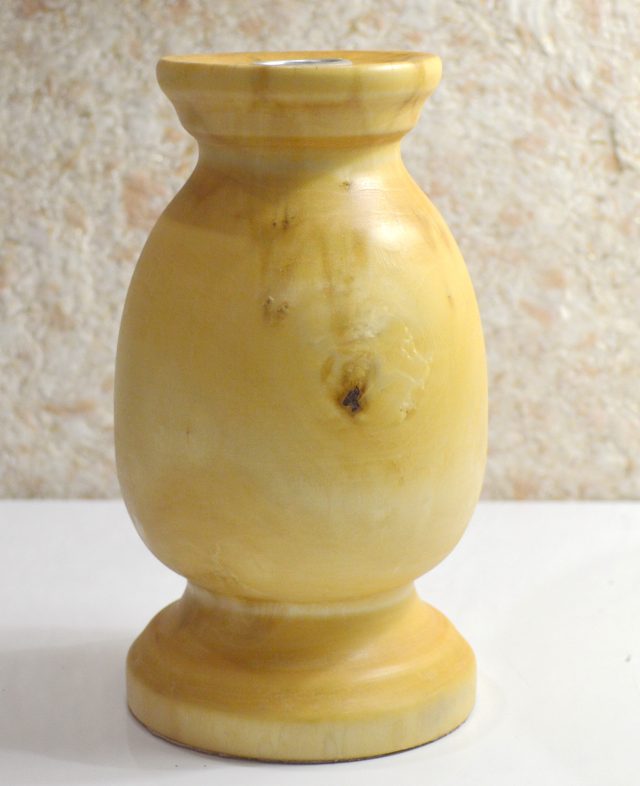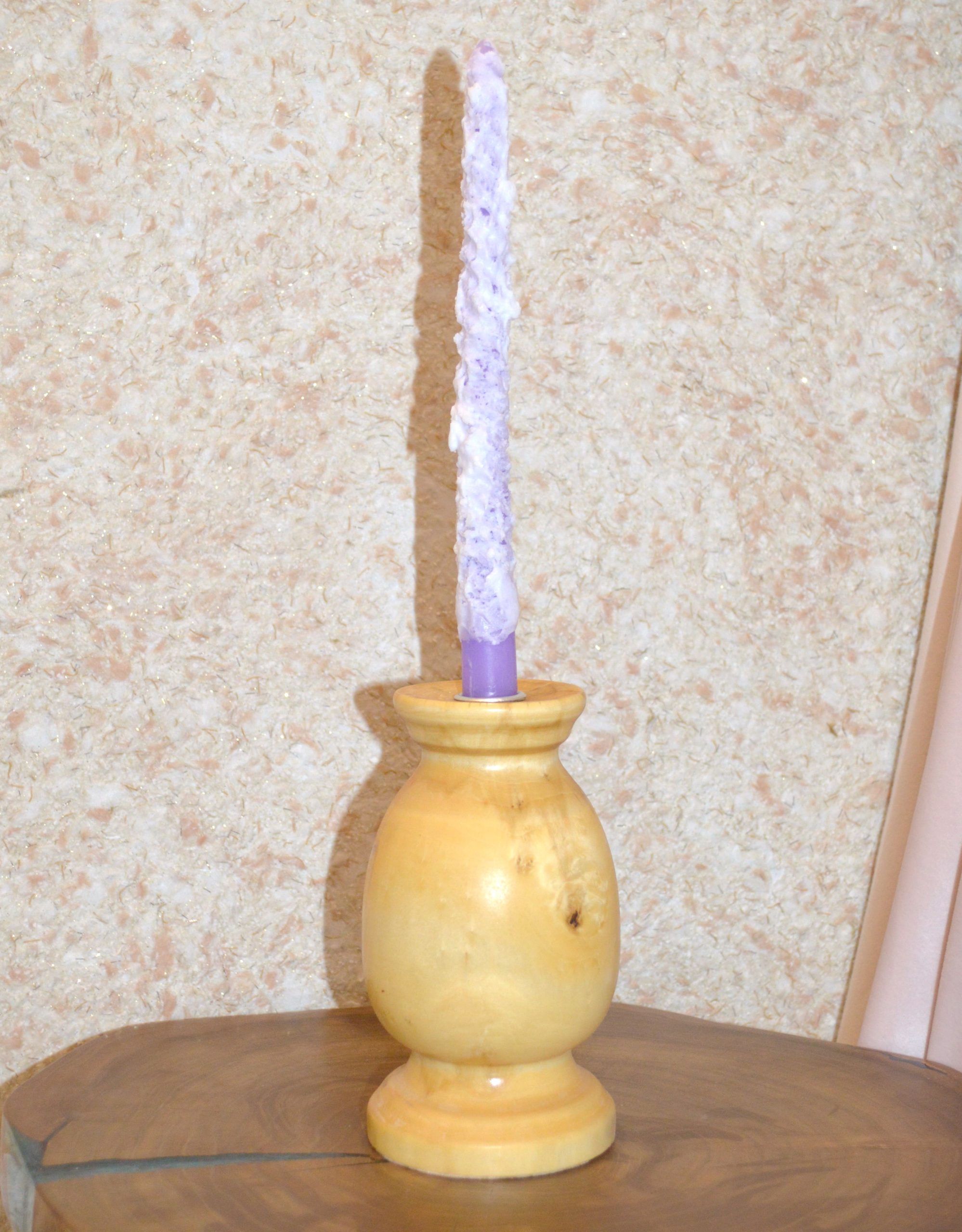 Деревянный, массивный подсвечник под высокую свечу. Выполнен из клёна. Высота подсвечника — 17 см. Посадочный диаметр под свечу — 2 см. Натуральная структура рисунка дерева. Покрыт лазурью. Ручная работа в единственном экземпляре. Одна свеча в комплекте.