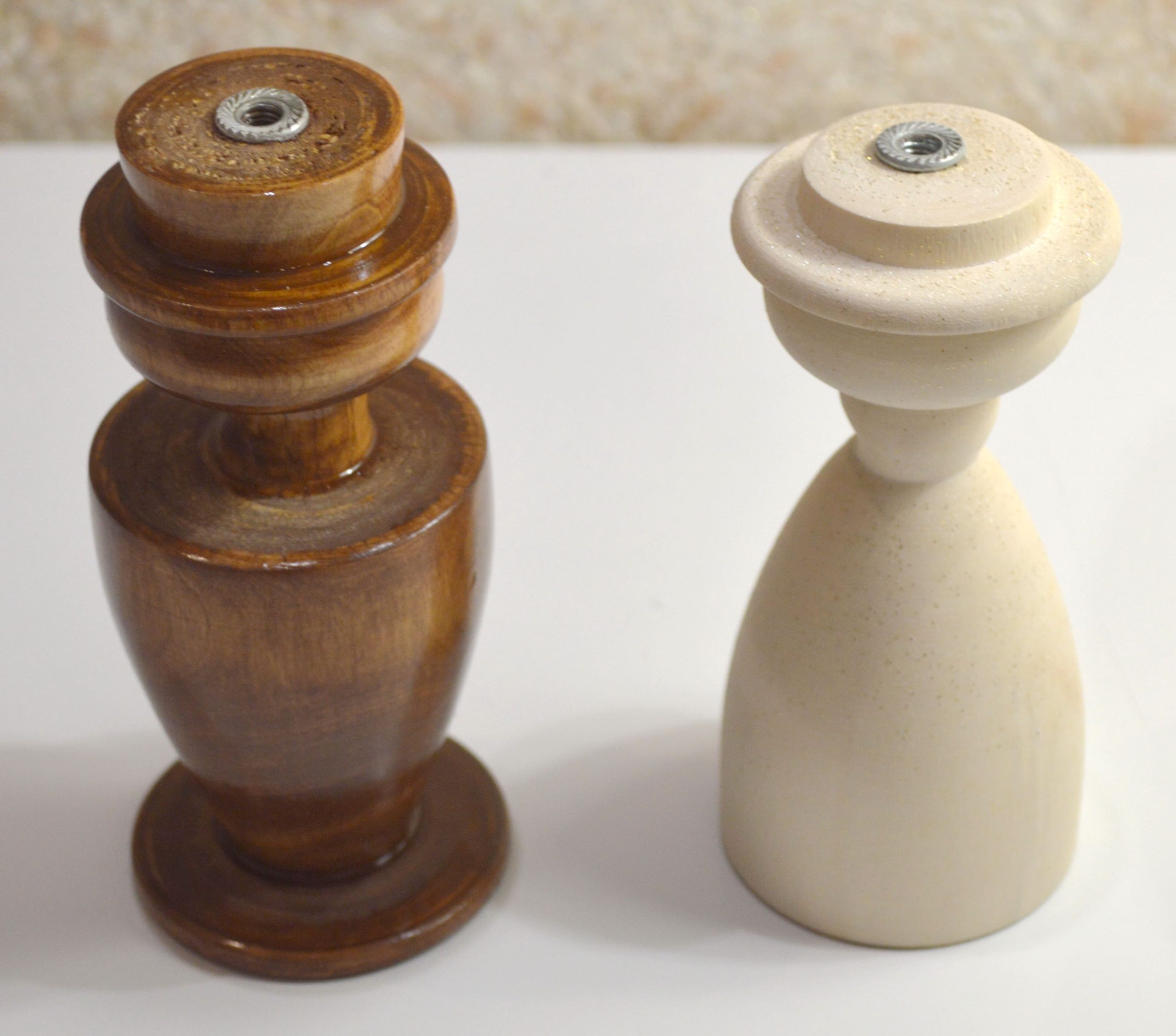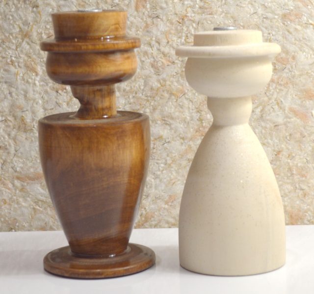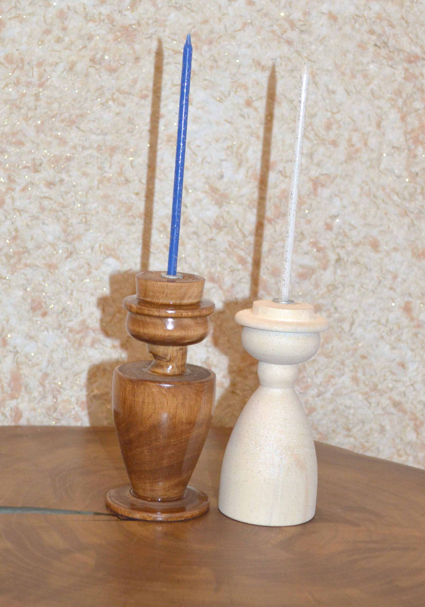 Оригинальная пара подсвечников под маленькие свечи. Фигурки выточены из массива клёна. Высота подсвечников: М — 13,7 см, Ж — 12,6 см. Посадочный диаметр под свечу — 5 мм (тортовые свечи). Покрытие: М — лакированной, тёмной лазурью, Ж — белой лазурью с добавлением блёсток. Ручная работа в единственном экземпляре. Две свечи в комплекте.