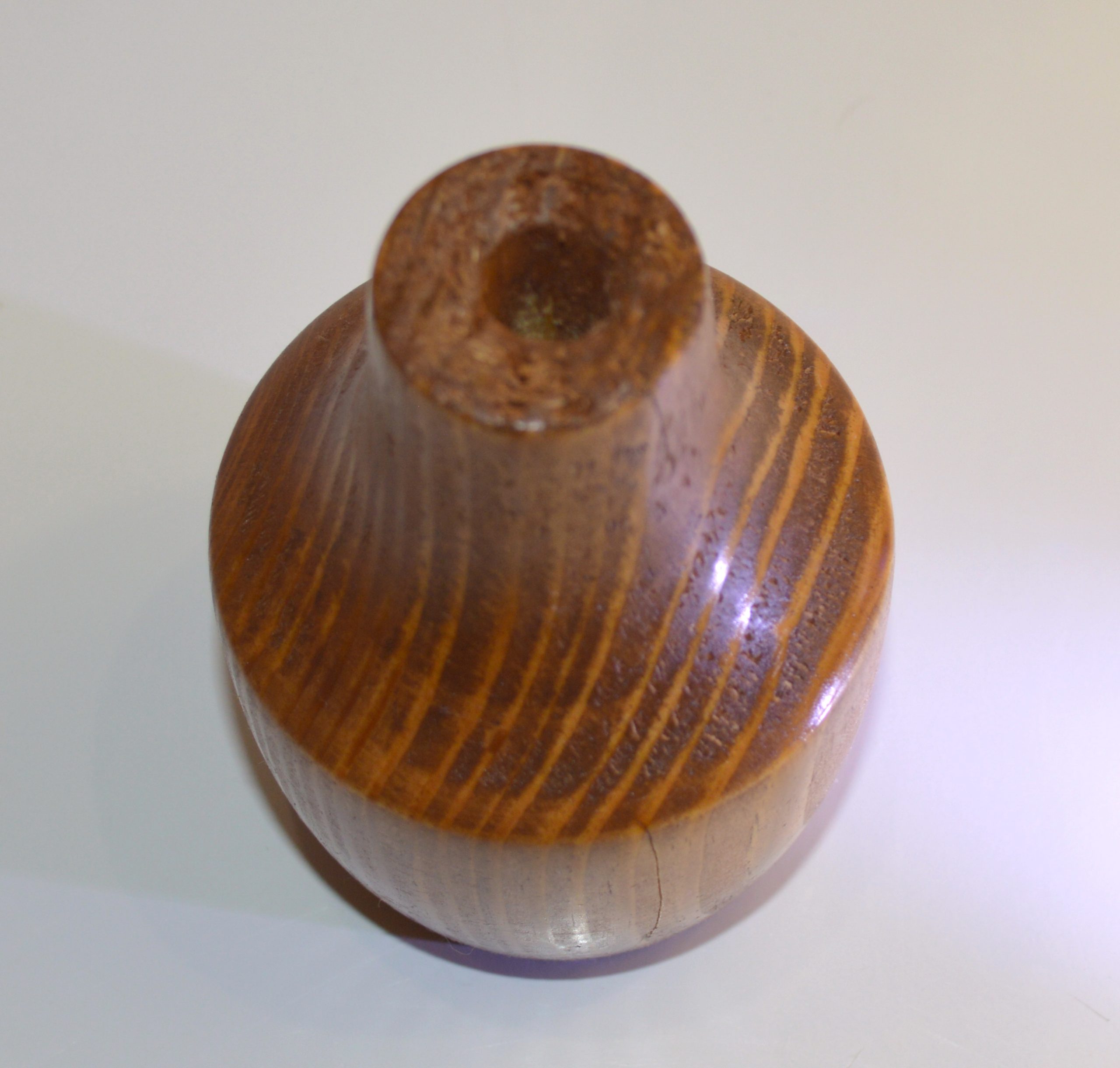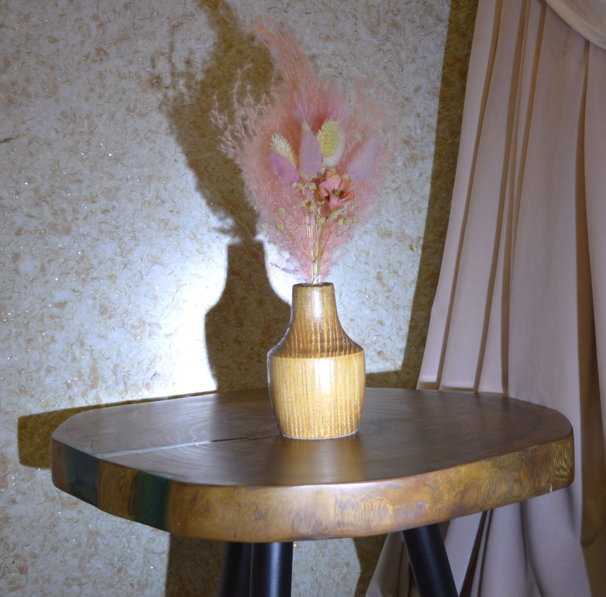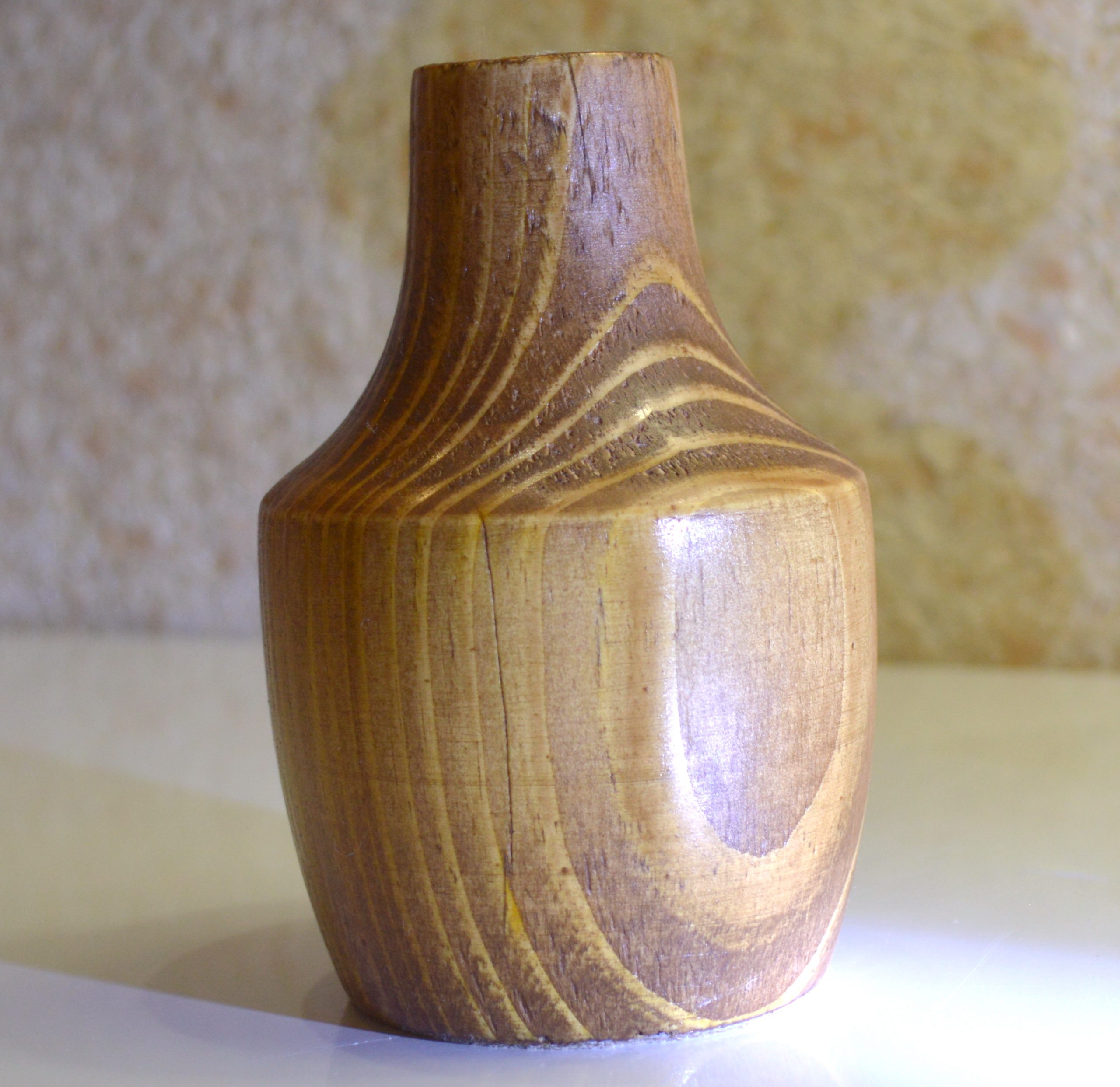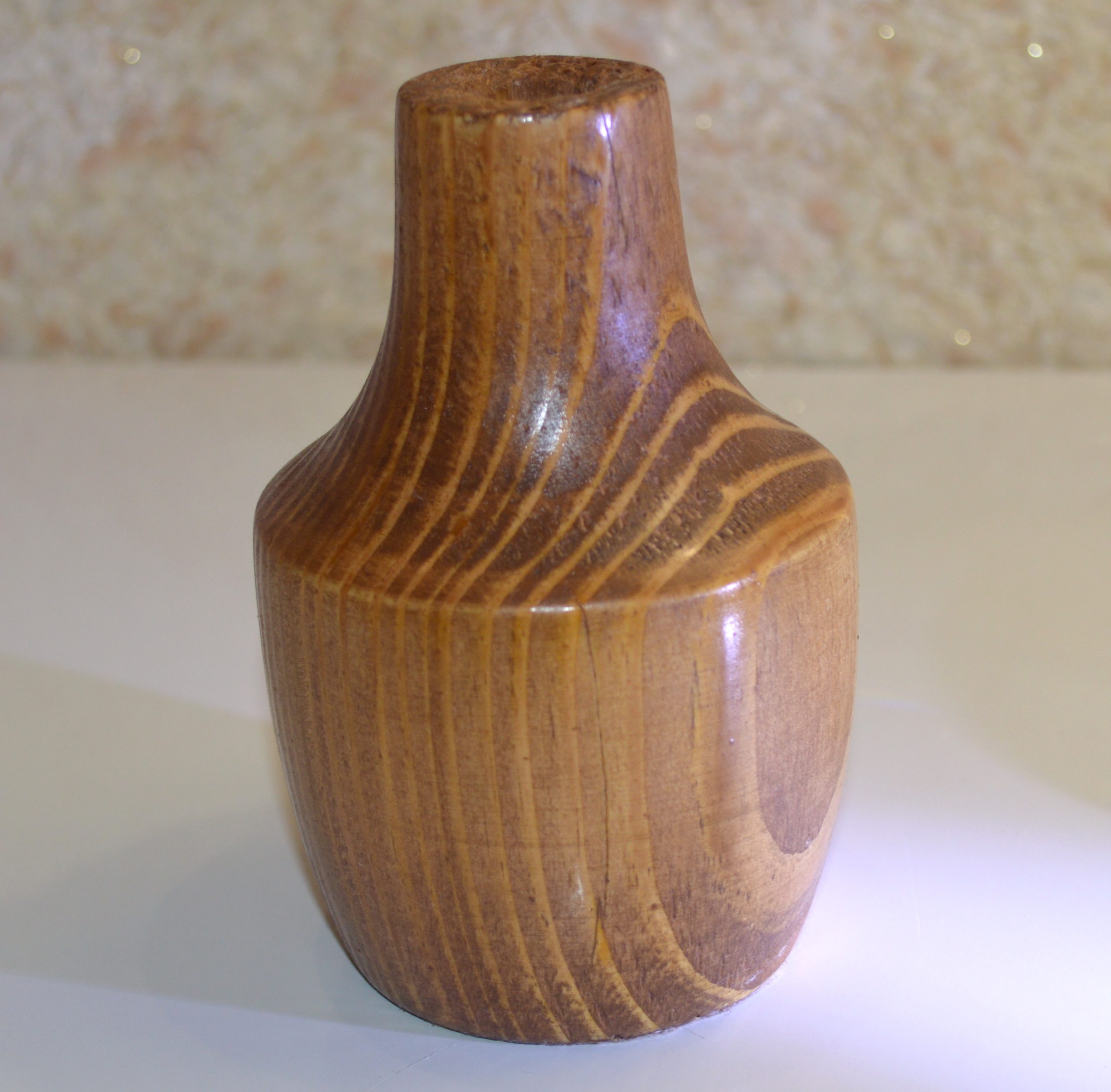Компактная, выполненная из массива сосны ваза под цветы сухоцветы. Размеры: высота — 11,7 см, диаметр горловины под стебли — 12 мм, глубина — 8,8 см. Естественный рисунок природного материала. Для более чёткого выделения рисунка, покрыта лазурью + масло-воском. Ручная работа в единственном экземпляре.