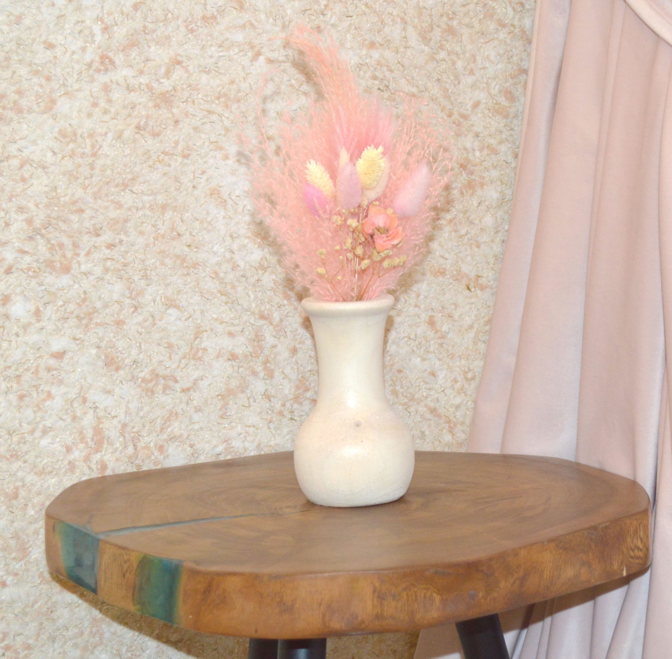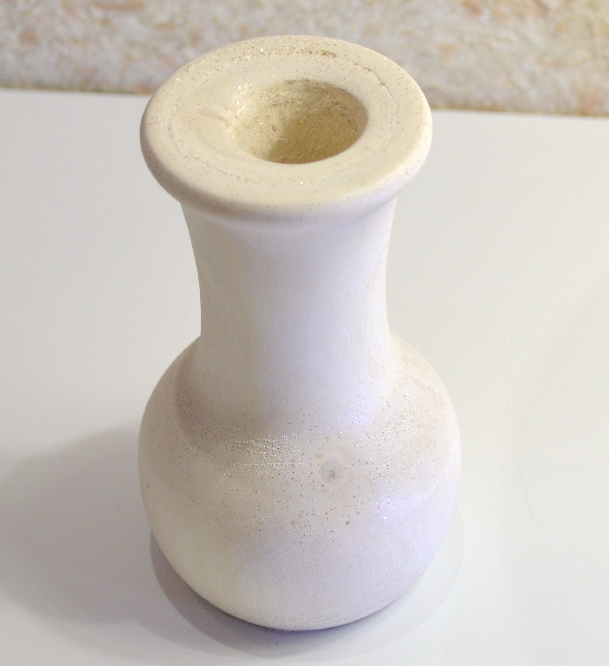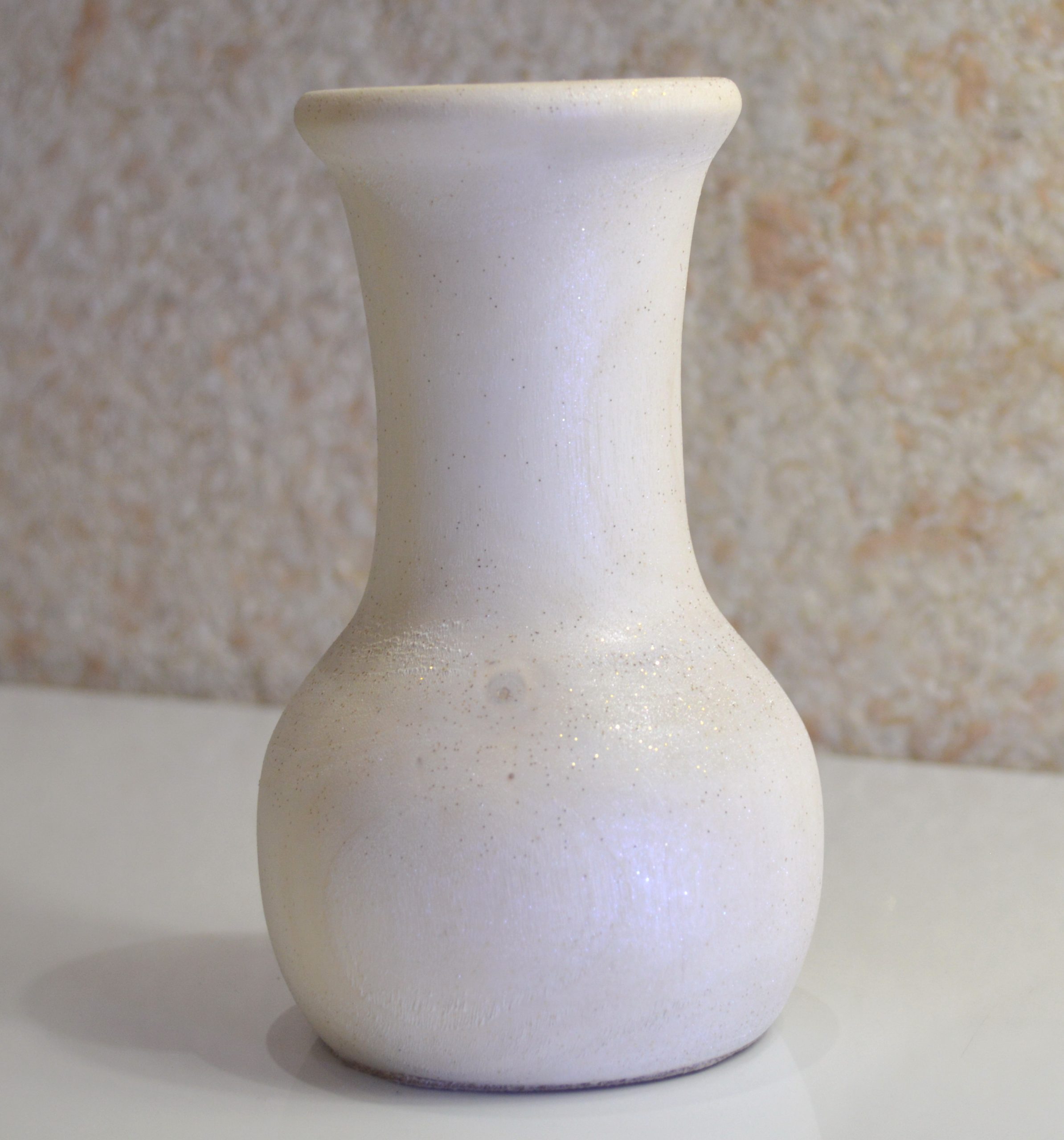 Компактная, средних размеров, выполненная из массива берёзы ваза под цветы сухоцветы. Размеры: высота — 14 см, диаметр горловины под стебли — 2,7 см, глубина — 11 см. Покрыта белой глазурью с добавлением блёсток. Ручная работа в единственном экземпляре.