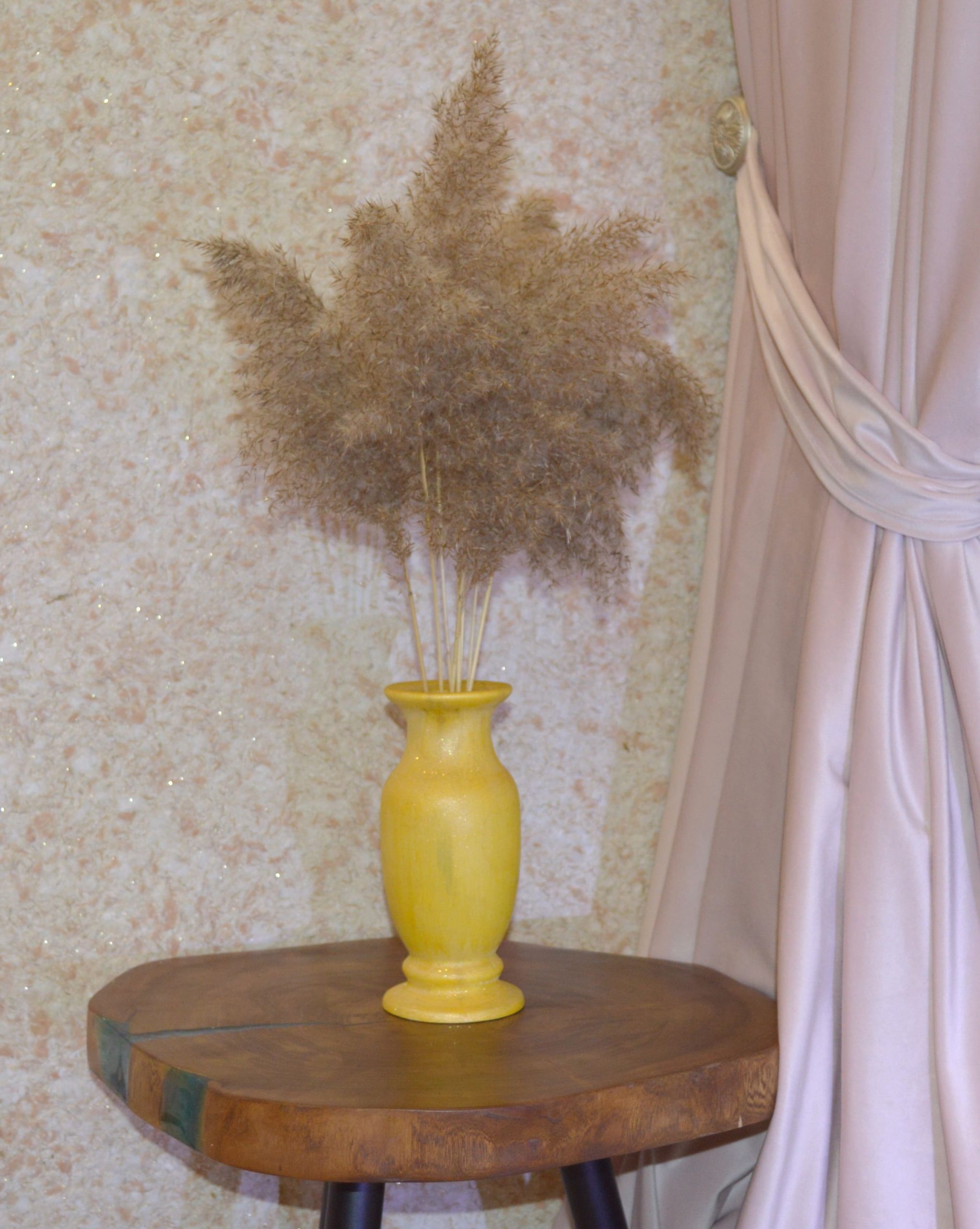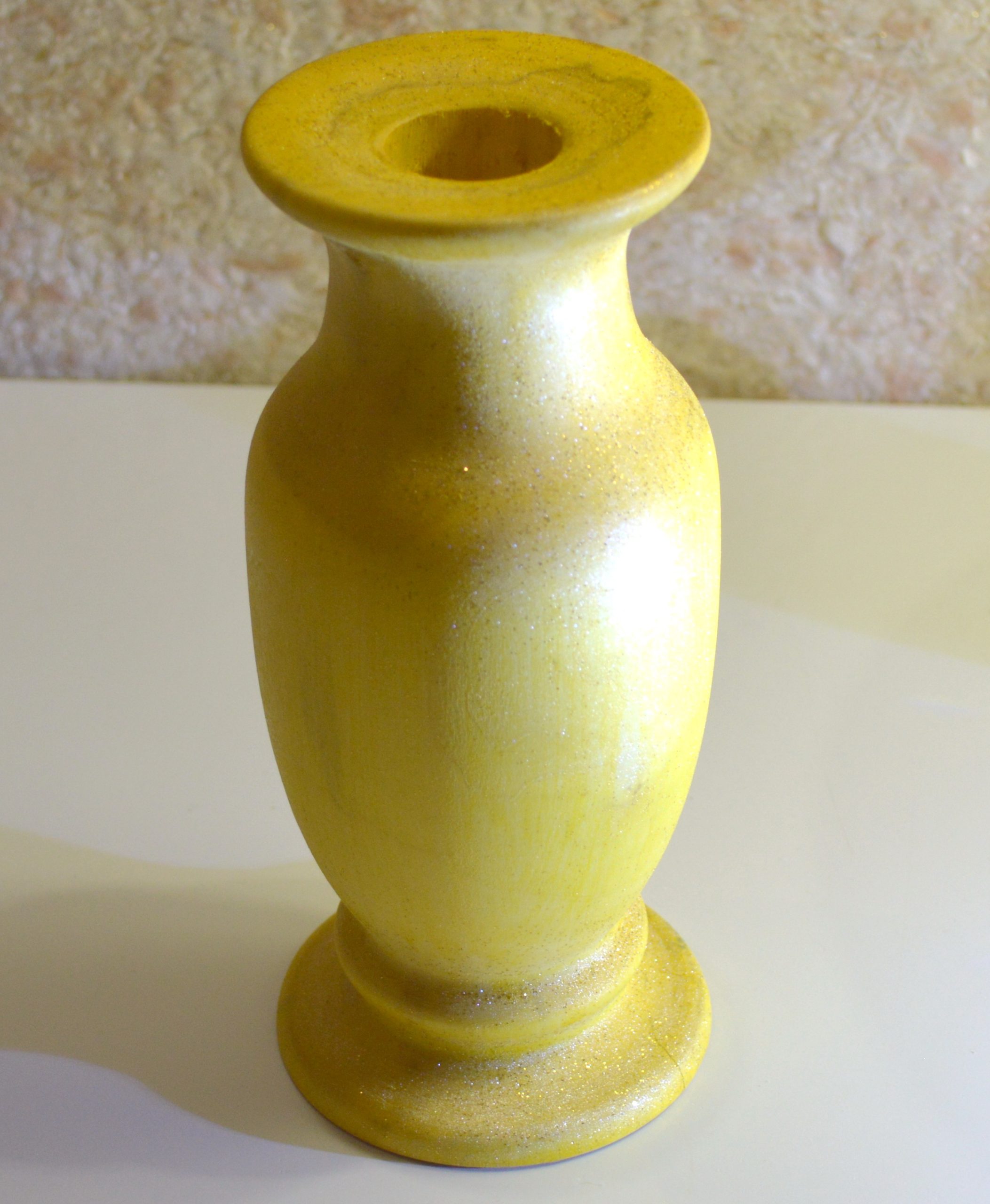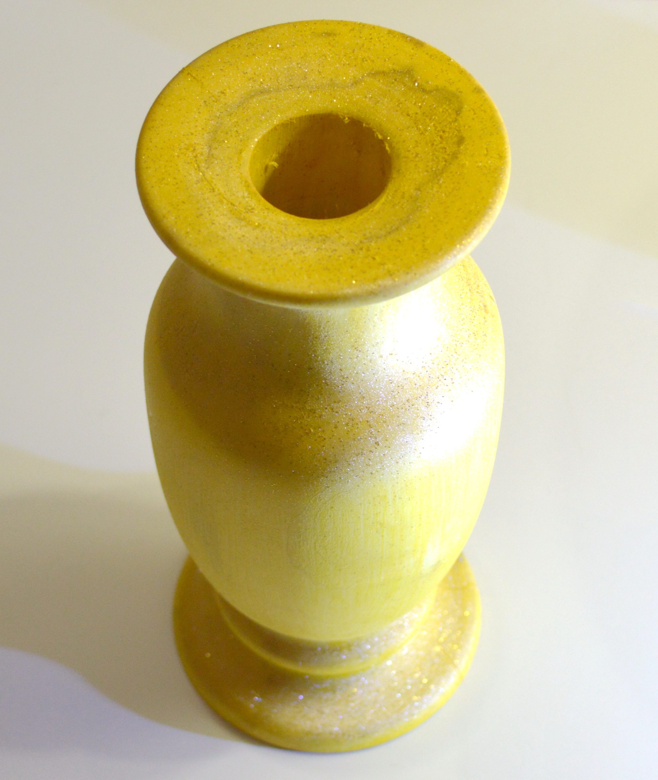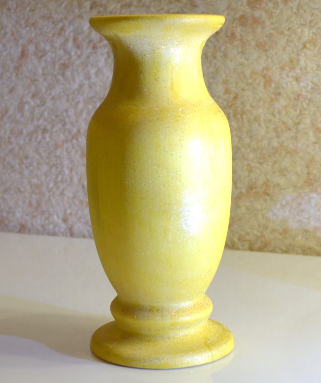 Экспериментальная, выполненная из массива клёна, ваза под цветы сухоцветы. Размеры: высота — 19 см, диаметр горловины под стебли — 2,8 см, глубина — 13 см. Покрыта жёлтой лазурью с добавлением блёсток. Ручная работа в единственном экземпляре.