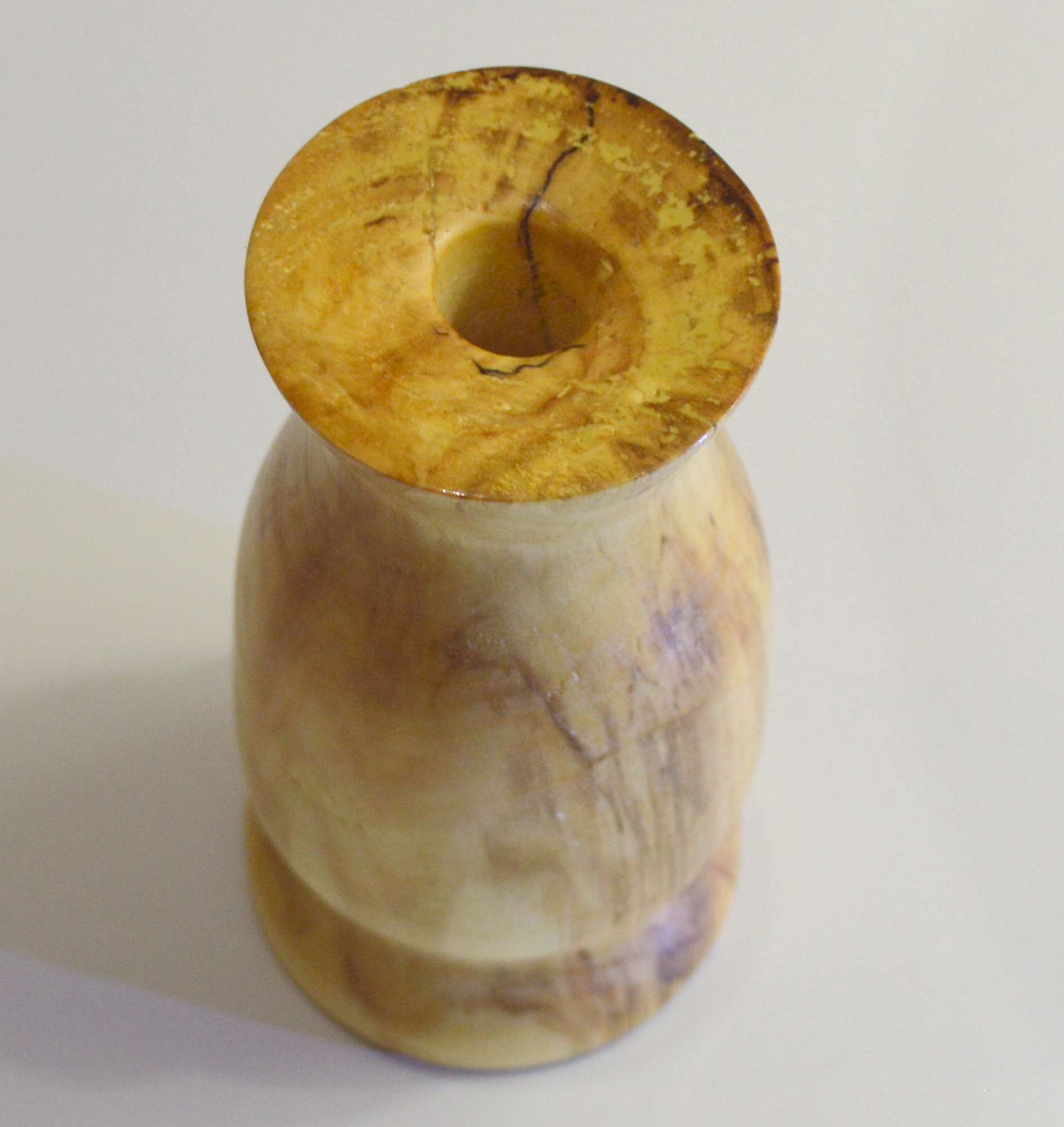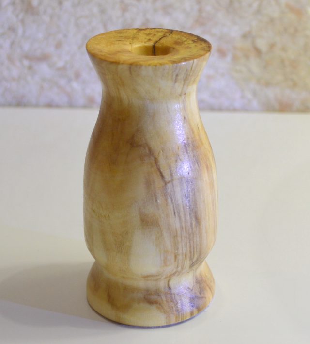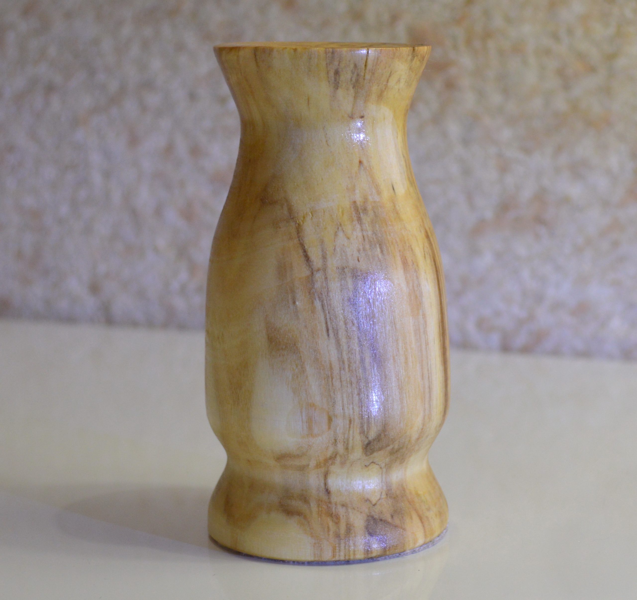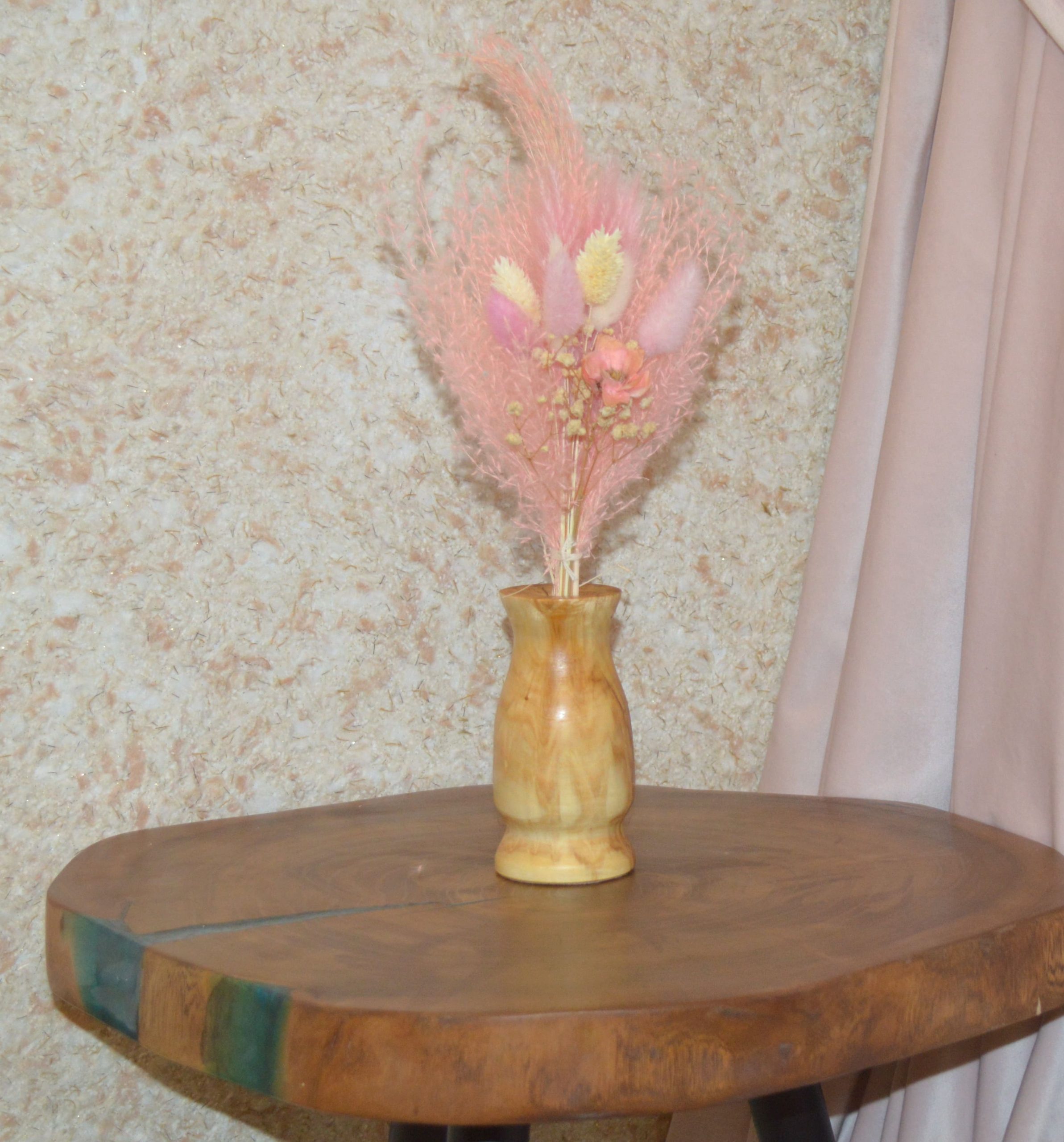 Небольших размеров, выполненная из массива клёна ваза под цветы-сухоцветы. Размеры: высота — 11,5 см, диаметр горловины под стебли — 1,5 см, глубина — 5,3 см. Естественный рисунок природного материала. Покрыта масло-воском. Ручная работа в единственном экземпляре.