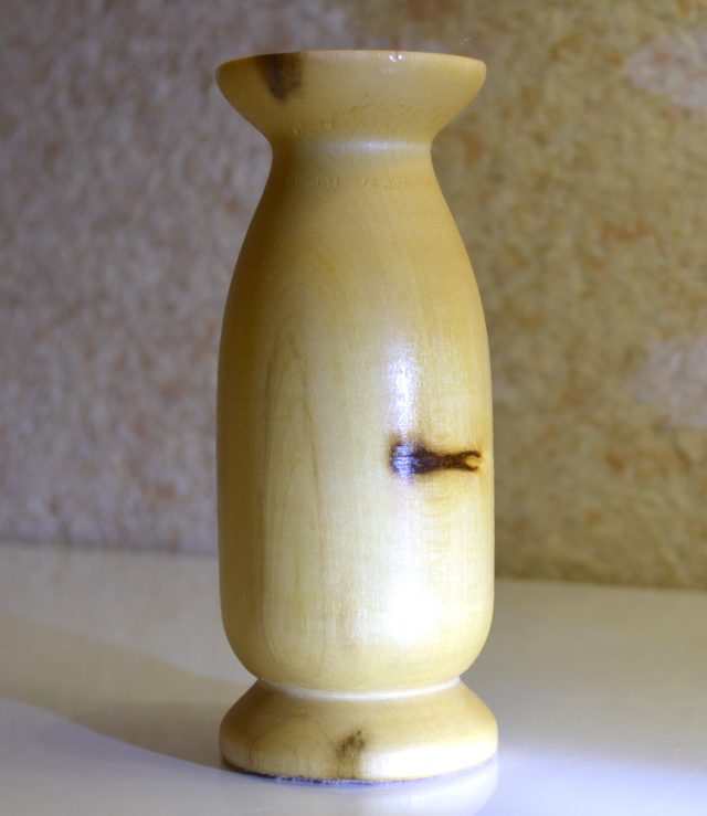 Компактная, средних размеров, выполненная из массива тополя ваза под цветы сухоцветы. Размеры: высота — 13,6 см, диаметр горловины под стебли — 14 мм, глубина — 6 см. Естественный рисунок природного материала. Покрыта масло-воском. Ручная работа в единственном экземпляре.
