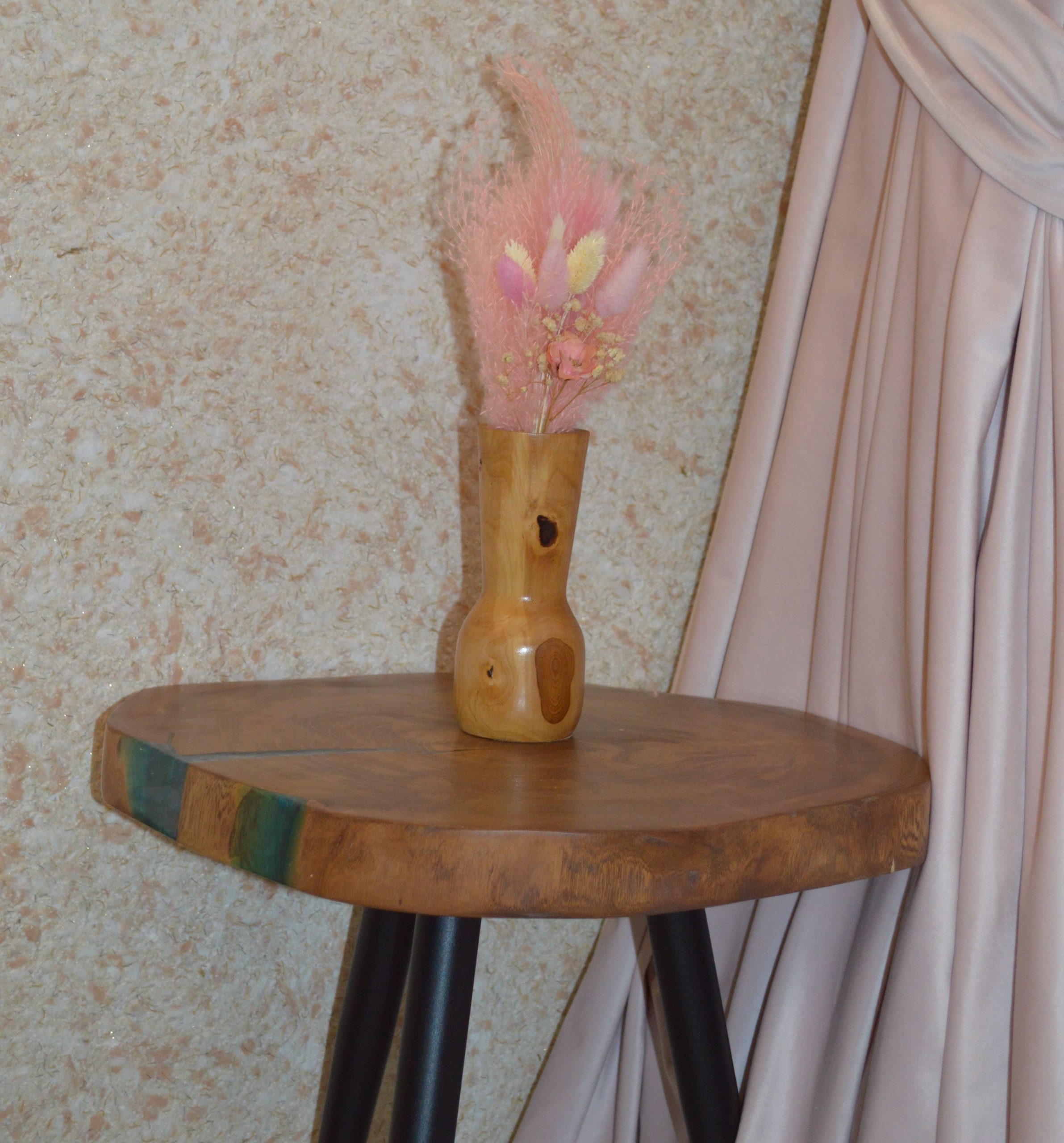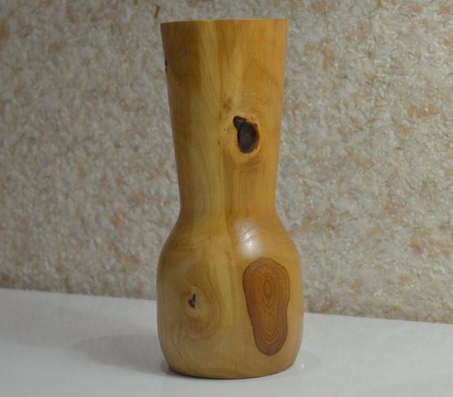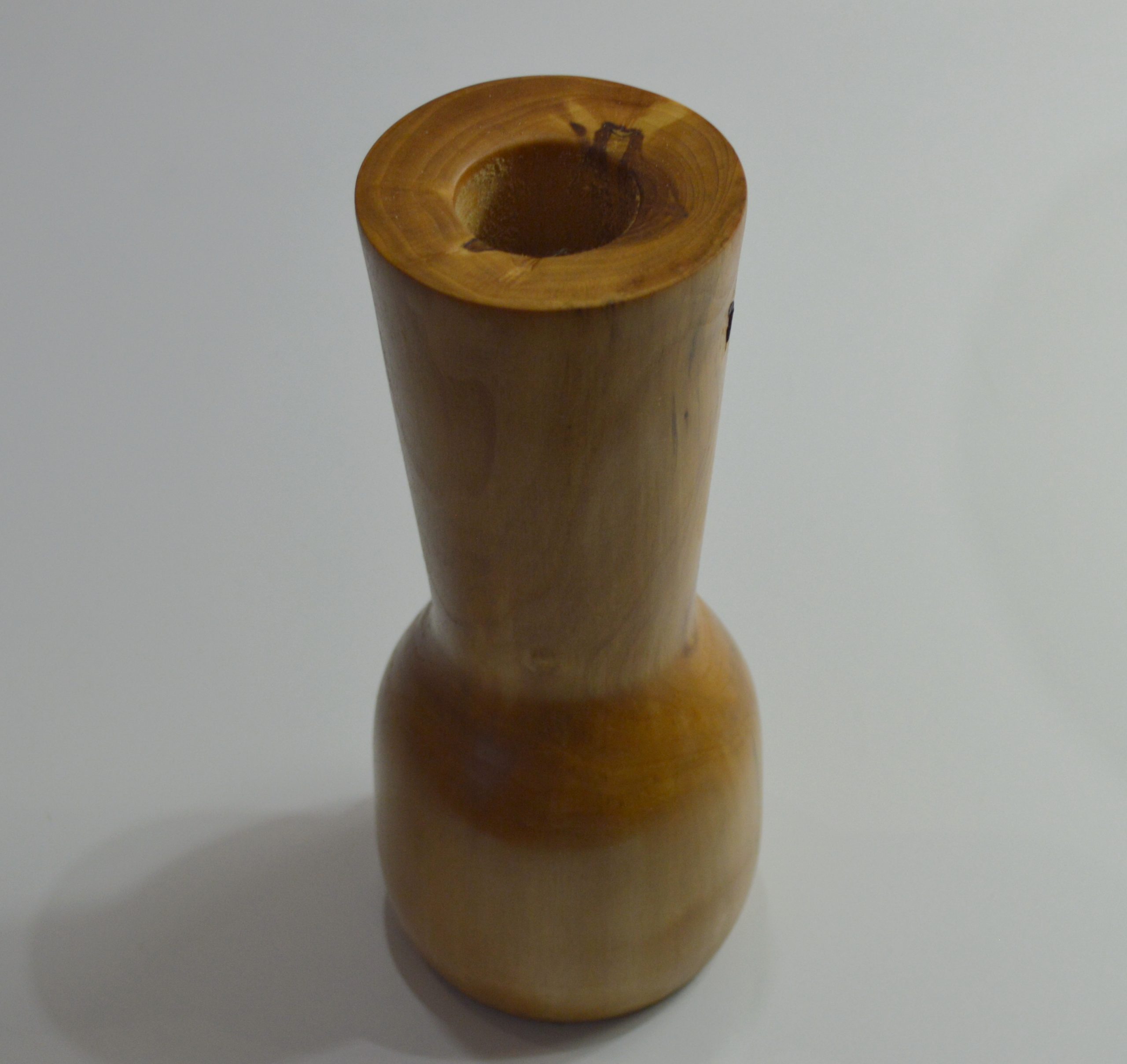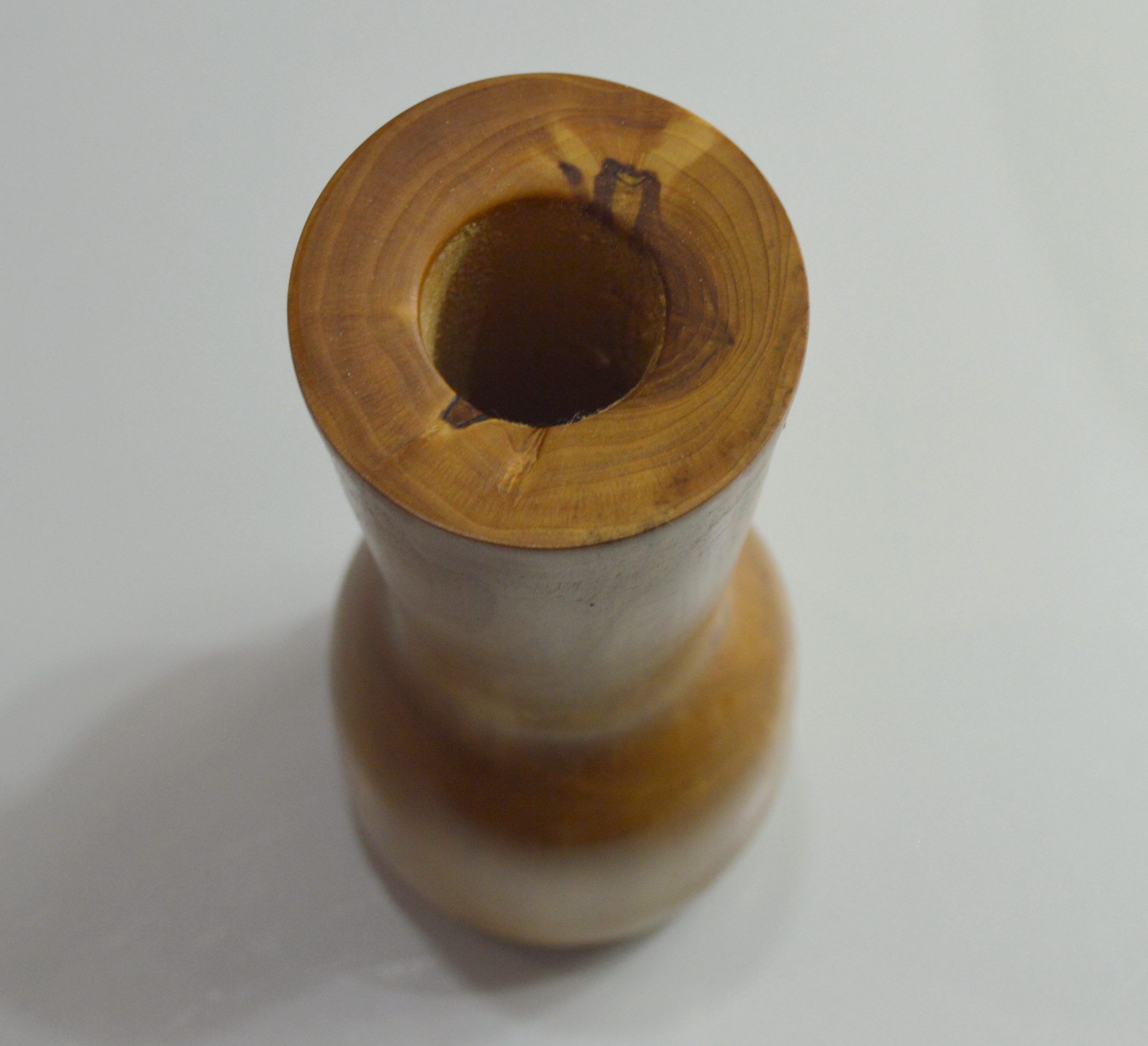 Компактная, средних размеров, выполненная из массива яблони ваза под цветы сухоцветы. Размеры: высота — 15,5 см, диаметр горловины под стебли — 2,8 см, глубина — 12 см. Естественный рисунок природного материала. Покрыта масло-воском. Ручная работа в единственном экземпляре.