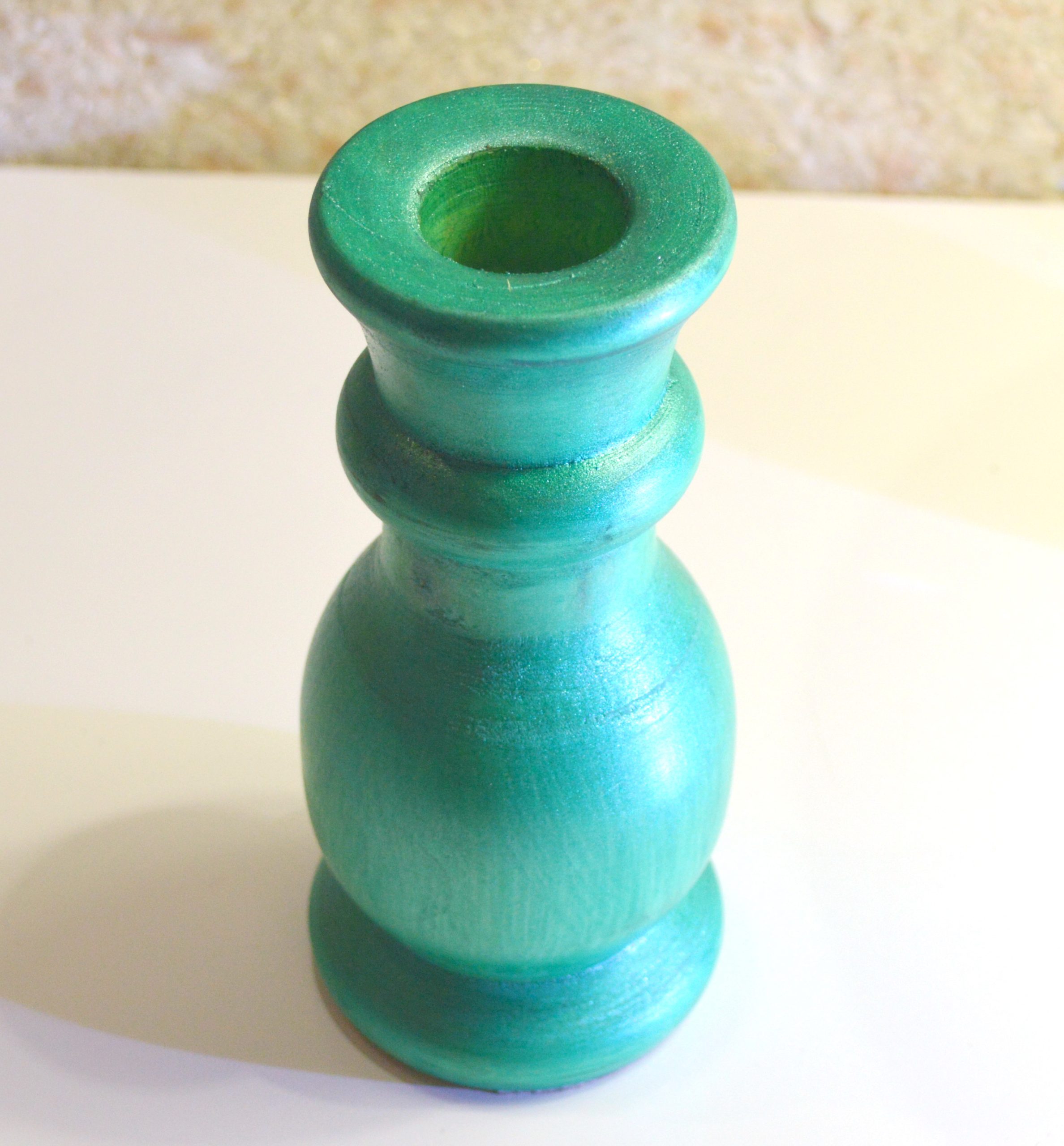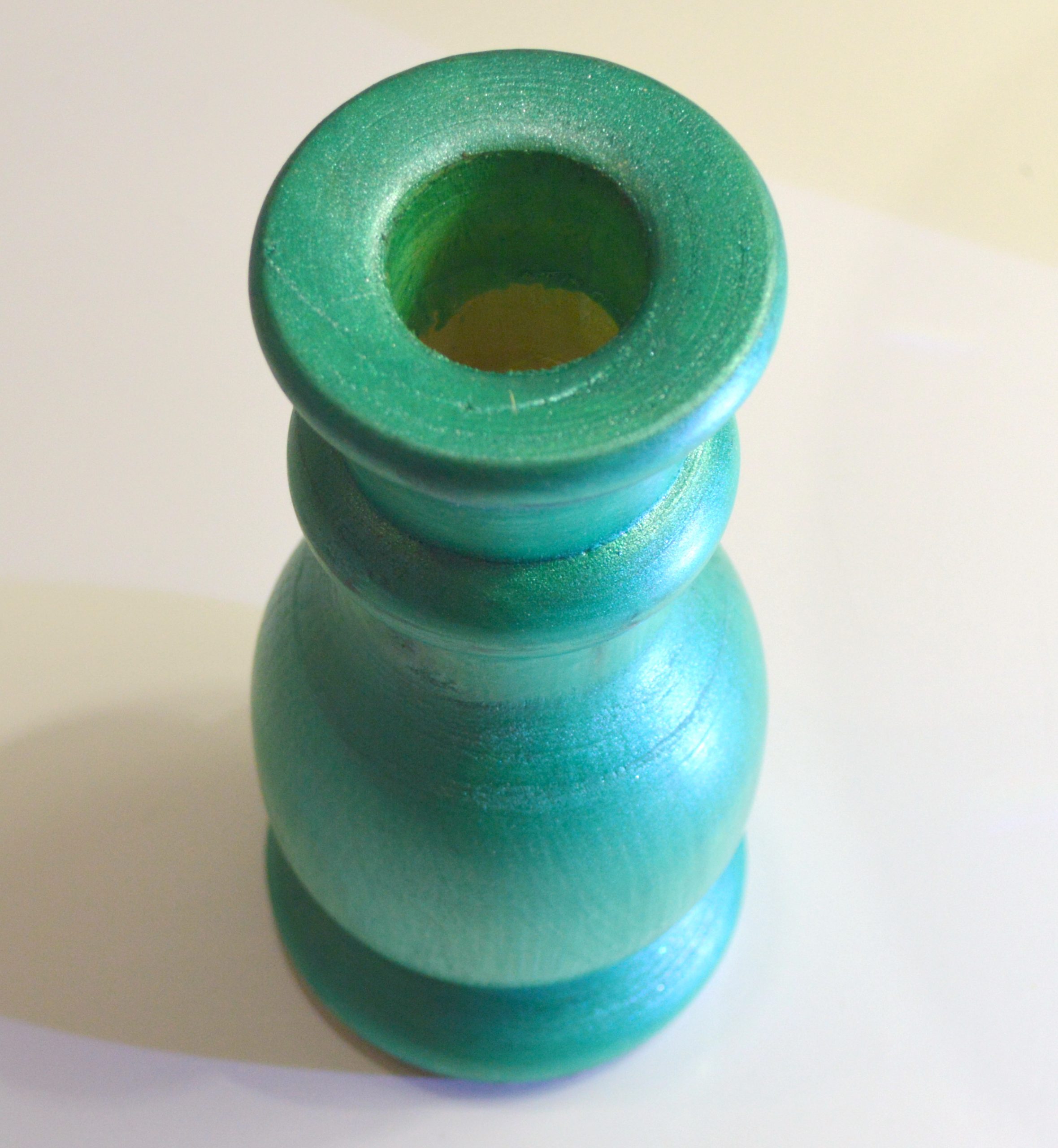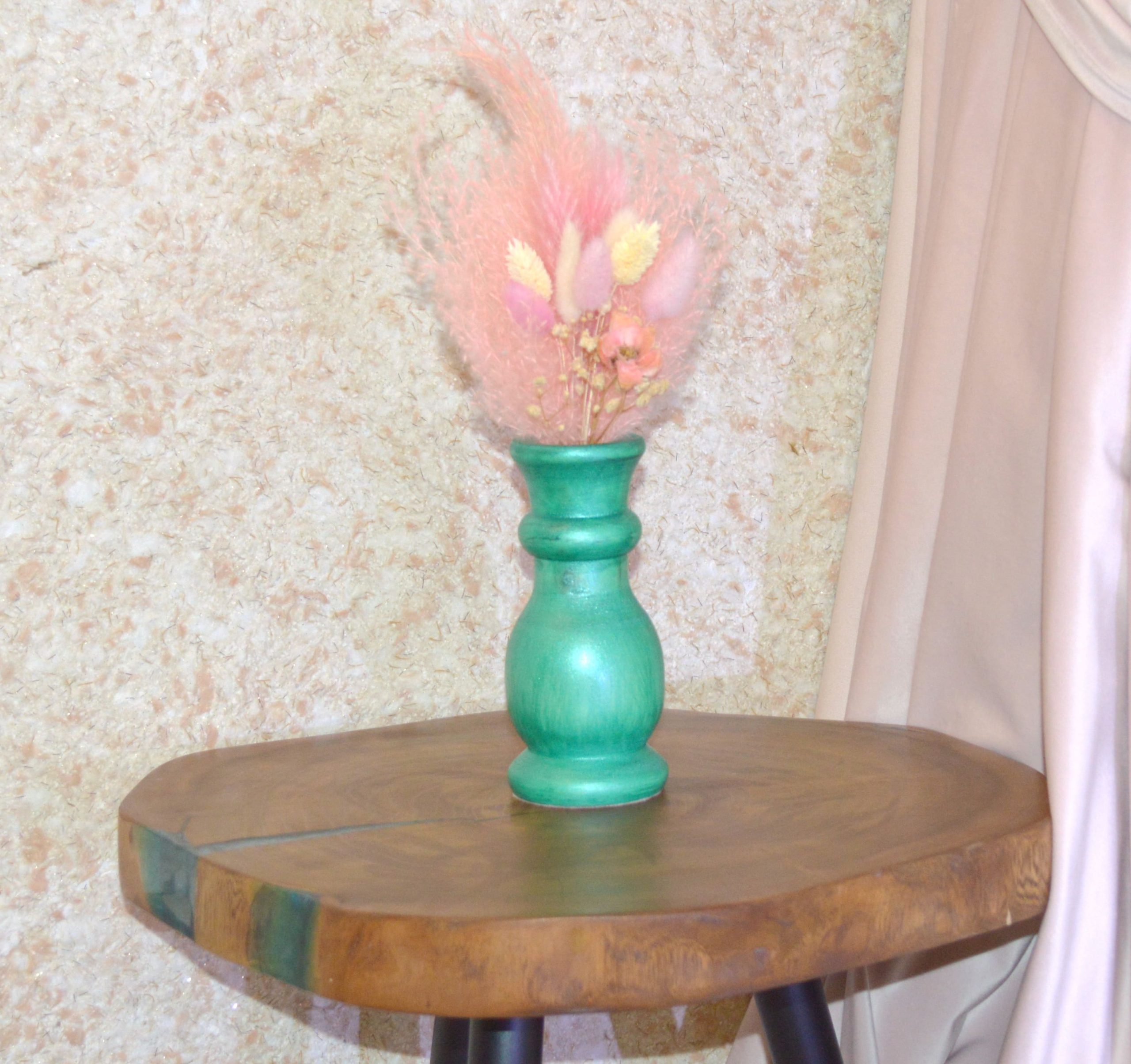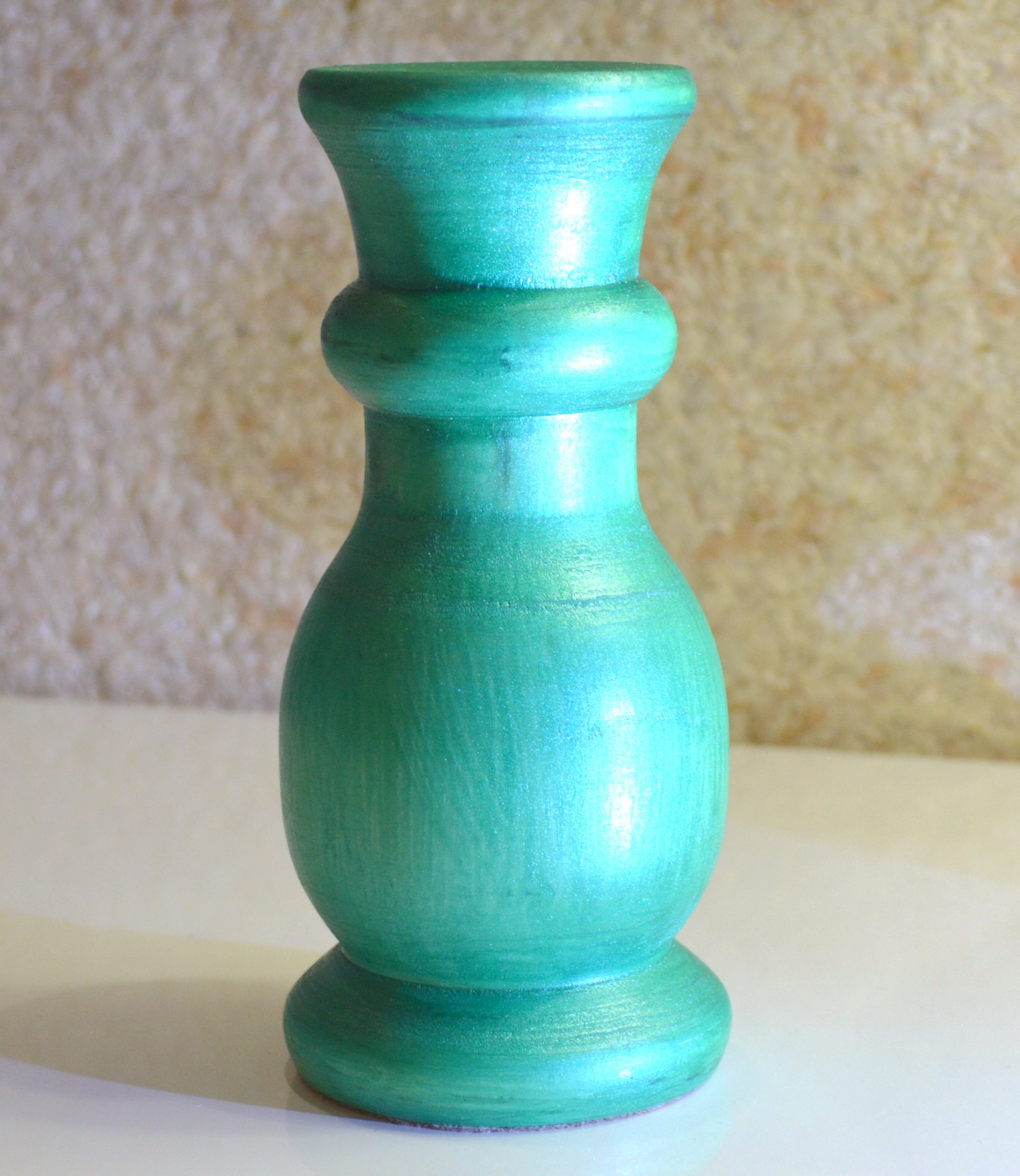 Компактная, средних размеров, выполненная из массива вяза, ваза под цветы сухоцветы. Размеры: высота — 16 см, диаметр горловины под стебли — 2,8 см, глубина — 10 см. Экспериментально обработана бирюзовой лазурью. Ручная работа в единственном экземпляре.