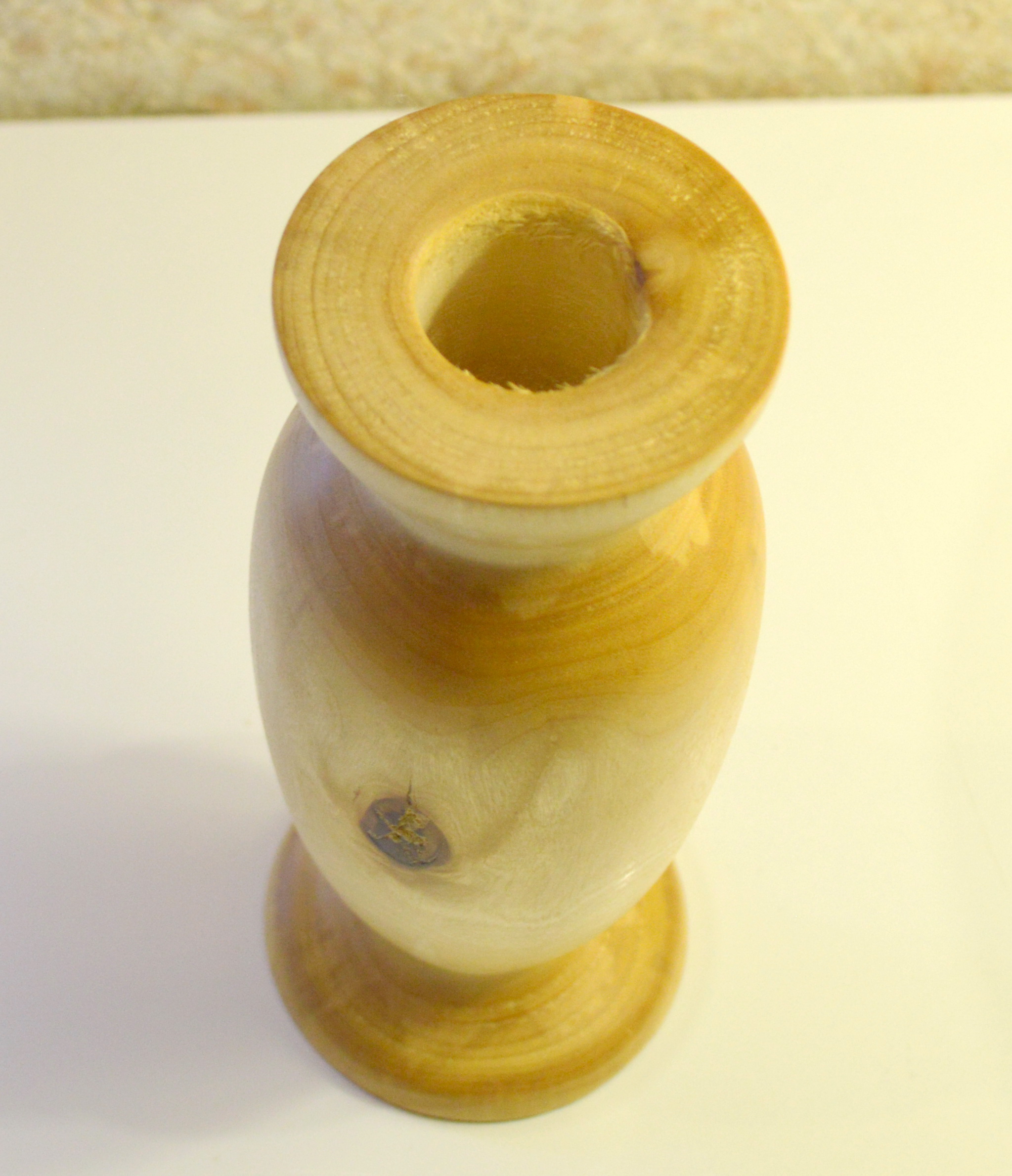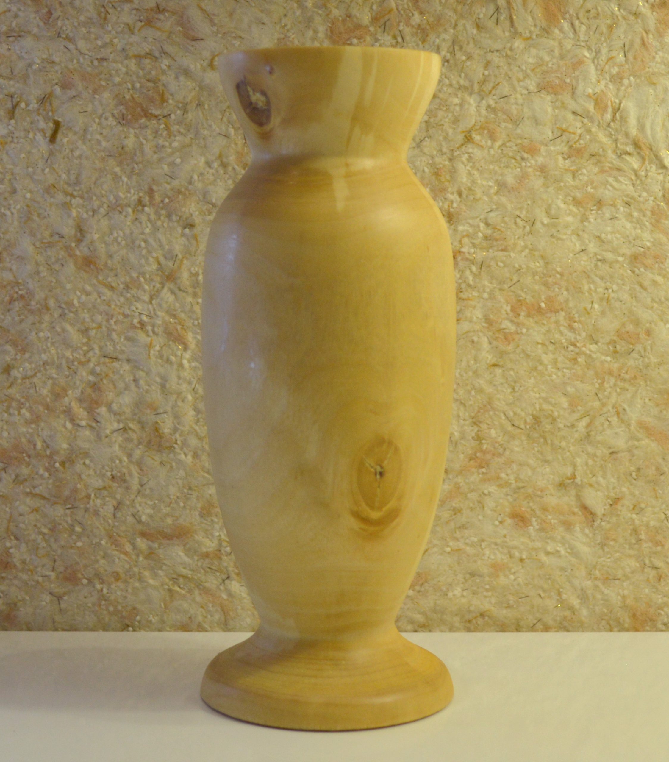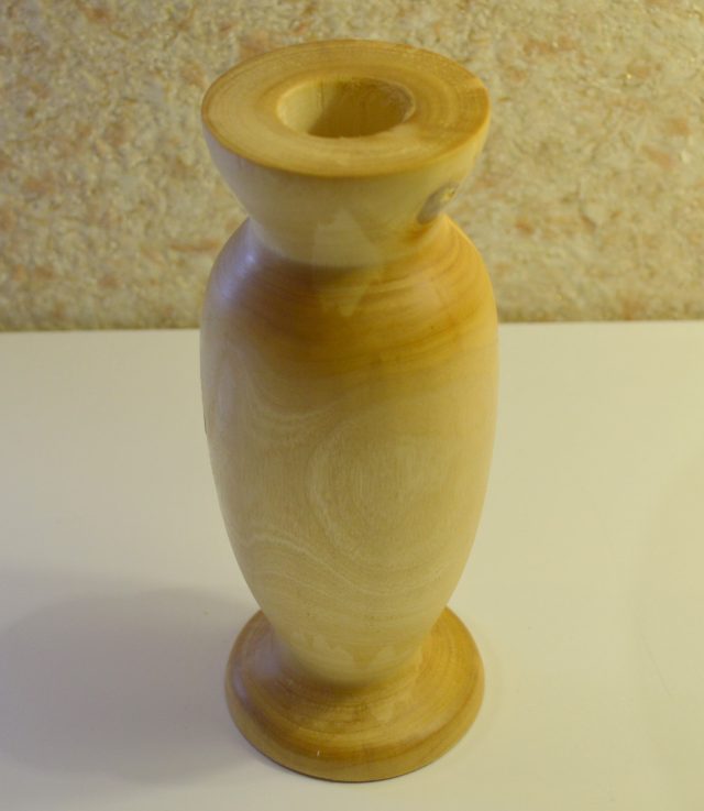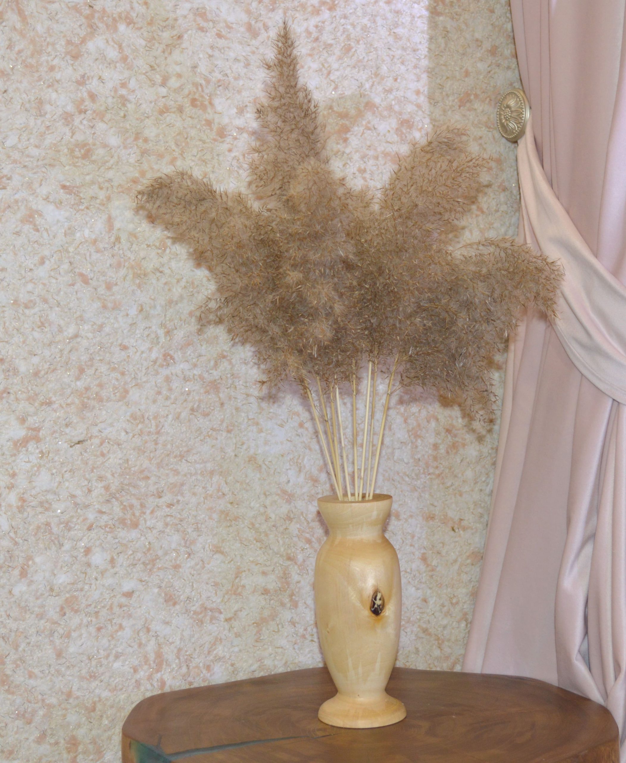 Светлая, выполненная из массива тополя, ваза под цветы сухоцветы. Размеры: высота — 19 см, диаметр горловины под стебли — 2,8 см, глубина — 13 см. Естественный рисунок природного материала. Покрыта: масло-воск. Ручная работа в единственном экземпляре.