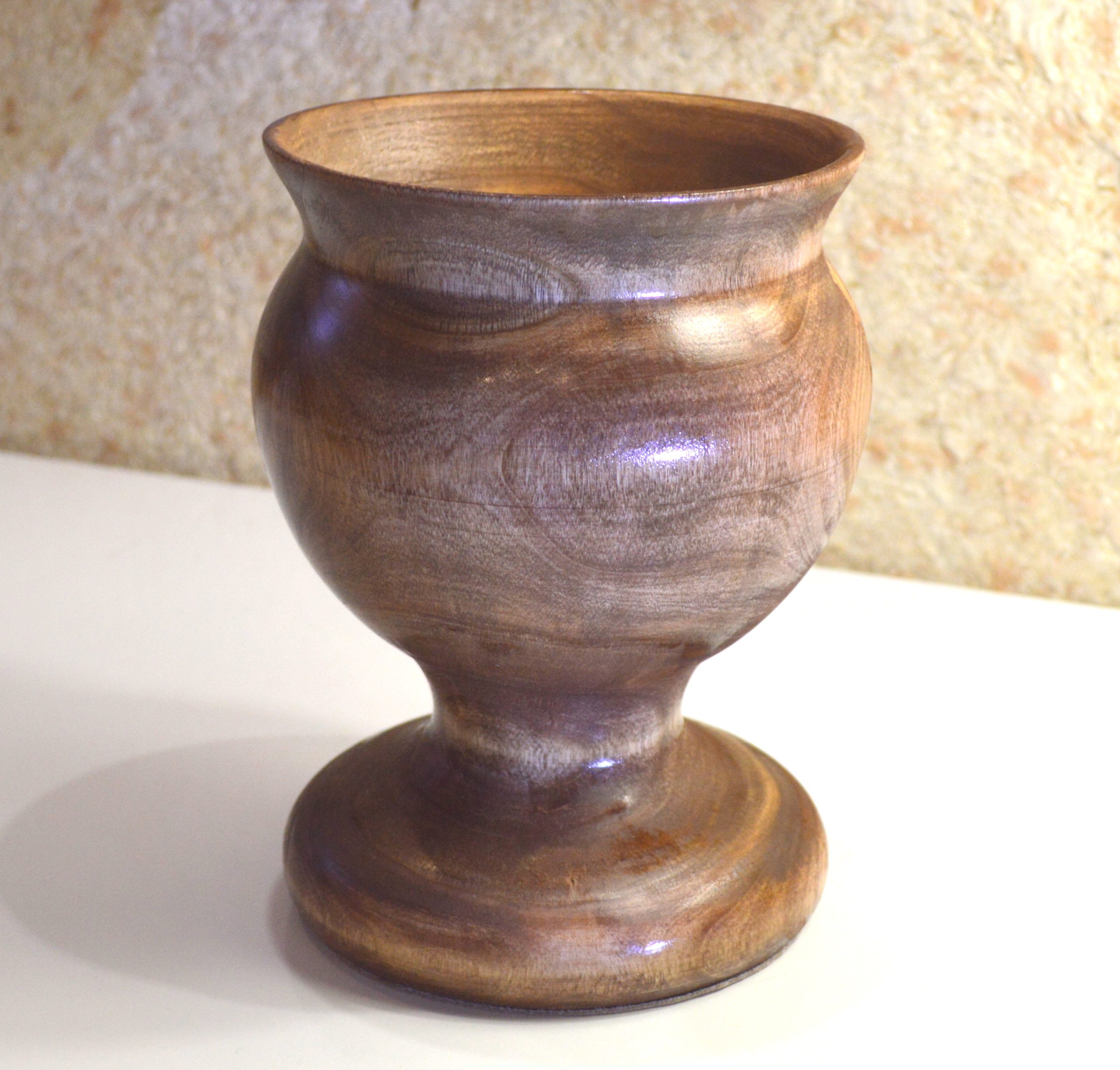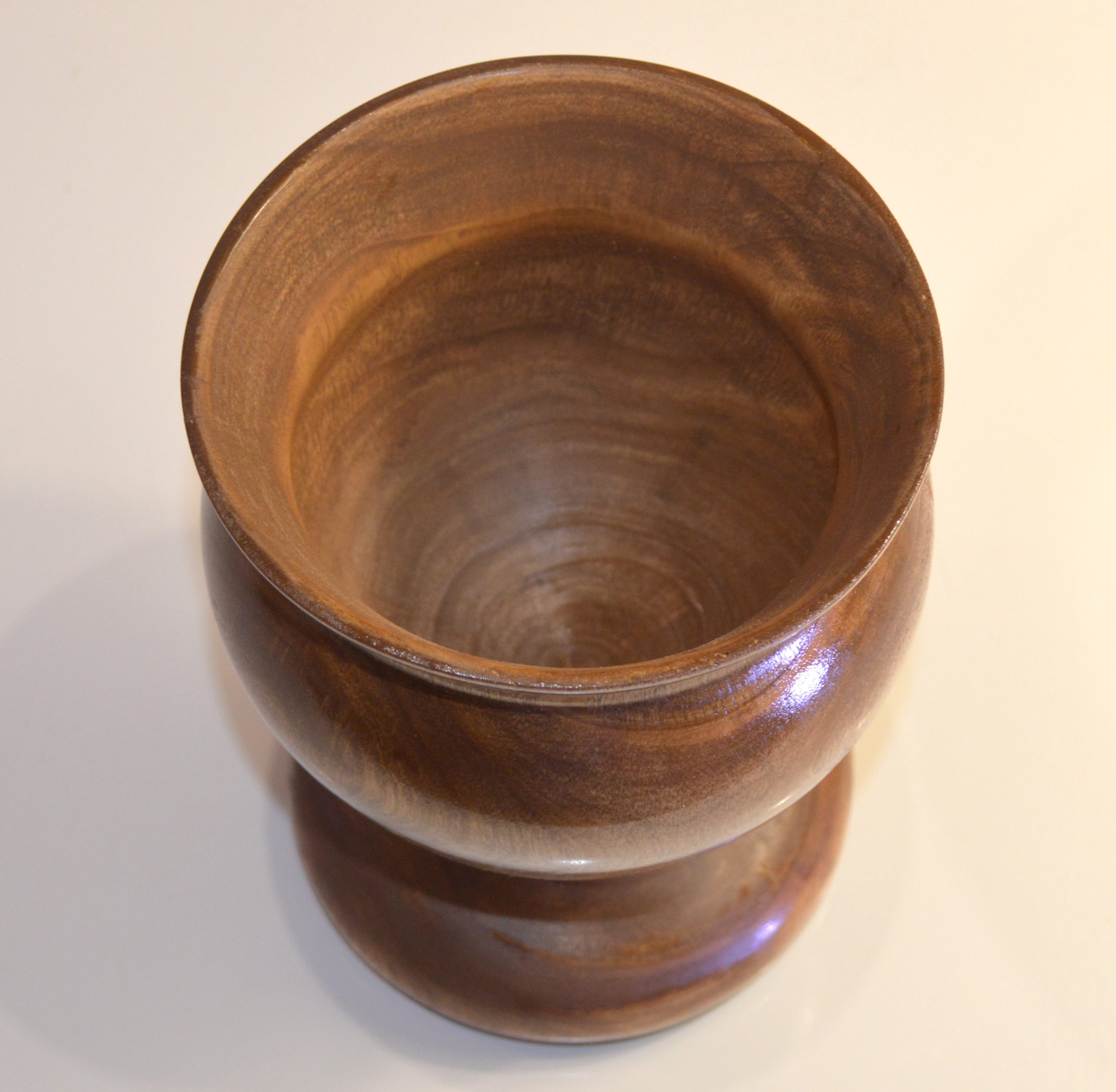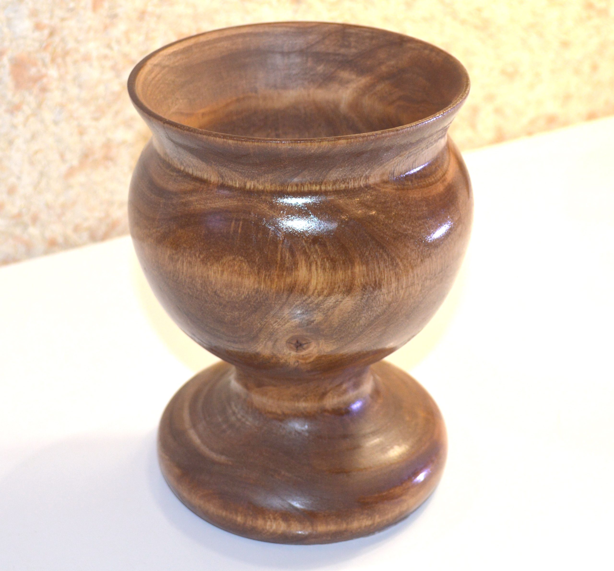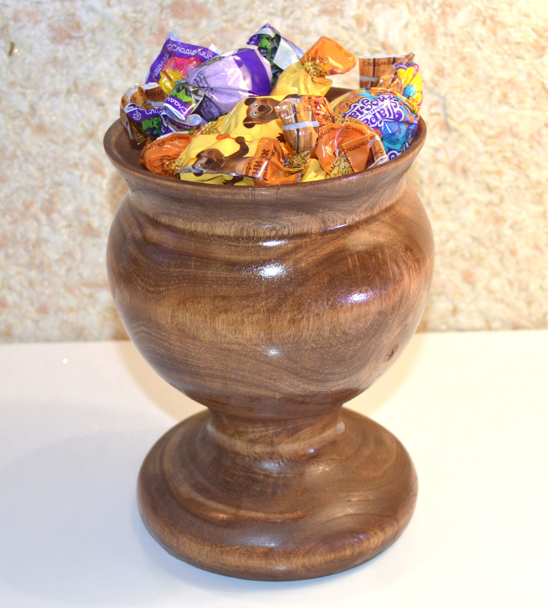 Выполненная с цельной ножкой, из массива тополя, настольная ваза для конфет, печенья, орехов, сухофруктов. Размеры: высота — 18 см, диаметр чаши — 13 см. Экологически чистое изделие. Красивый, естественный рисунок природного материала. Для защиты дерева, изнутри, покрыта натуральным маслом с добавлением пчелиного воска, наружное покрытие — лазурь. Ручная работа в единственном экземпляре.